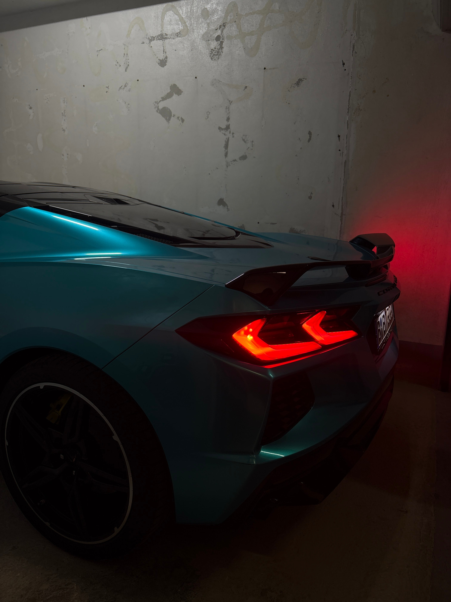 A teal Corvette sports car is parked closely to a grey textured wall in what appears to be a parking garage or a similar confined space. The focus is on the rear of the car, highlighting the illuminat…read more