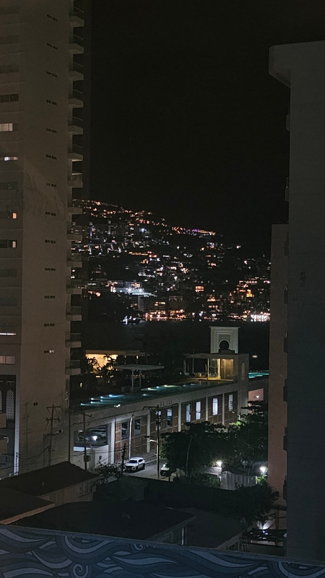 This nighttime, upside-down view from an elevated position shows buildings and lights, likely in Acapulco, Mexico. The left side of the frame is mostly dark. In the center, a dense cluster of lights sā¦read more