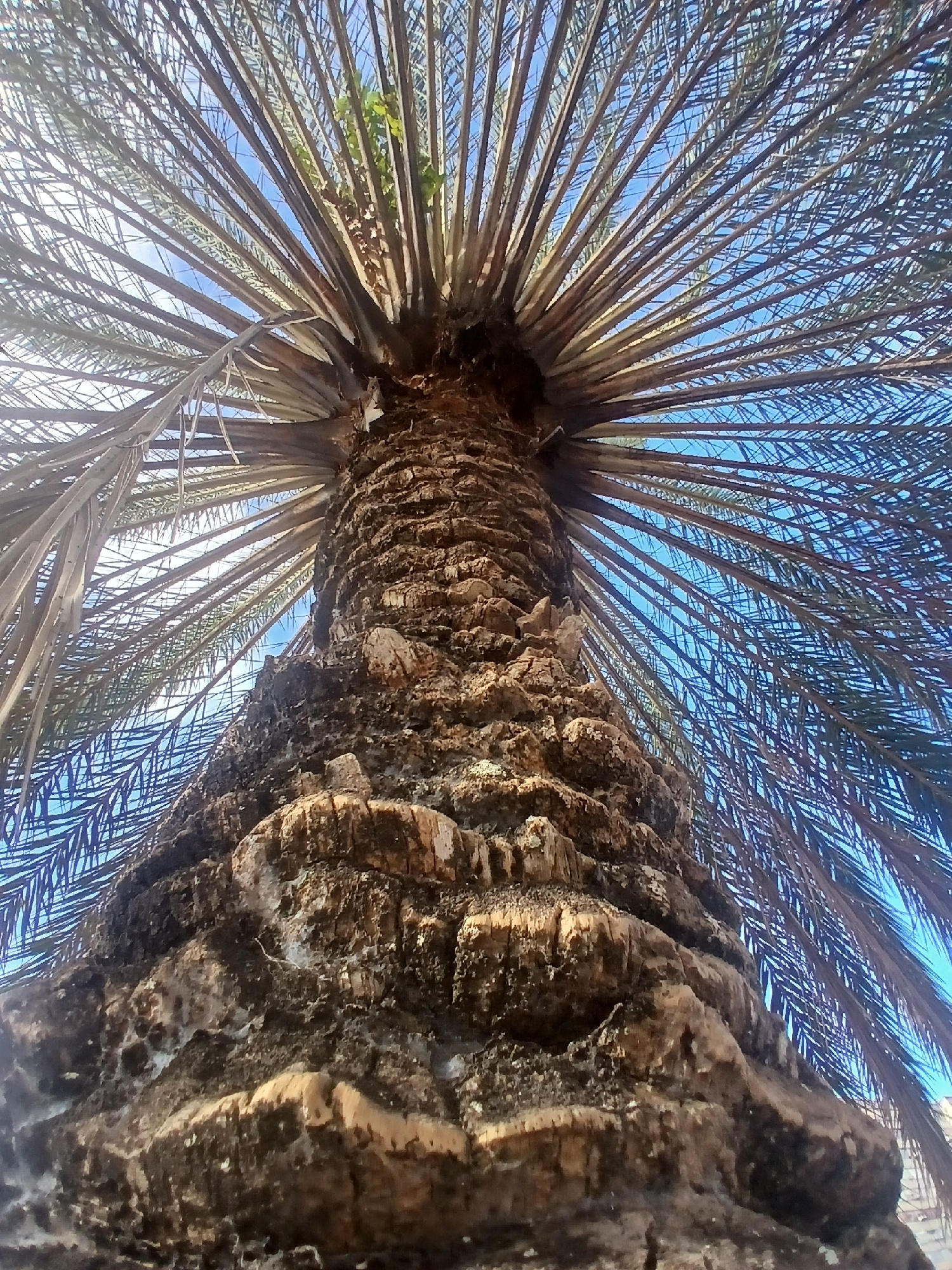 A low-angle photograph captures the imposing trunk and radiating fronds of a palm tree in Ciudad Guayana, Venezuela. The central and dominant feature is the tree's thick, heavily textured trunk, displ…read more