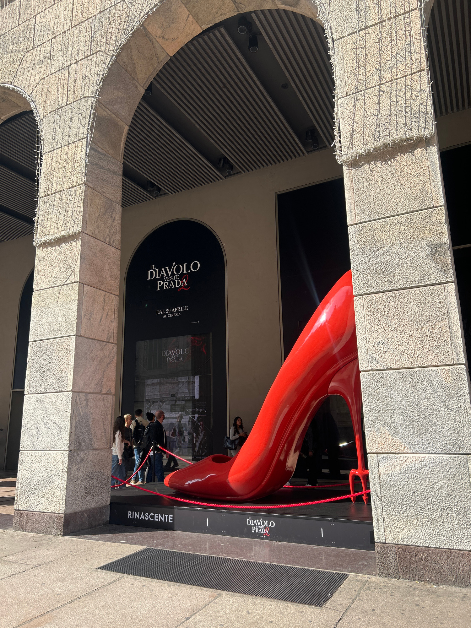 The image depicts an architectural storefront or window display related to the film "The Devil Wears Prada" ("Il Diavolo Veste Prada"), located in Milan, Italy. The display includes a large, red, scul…read more
