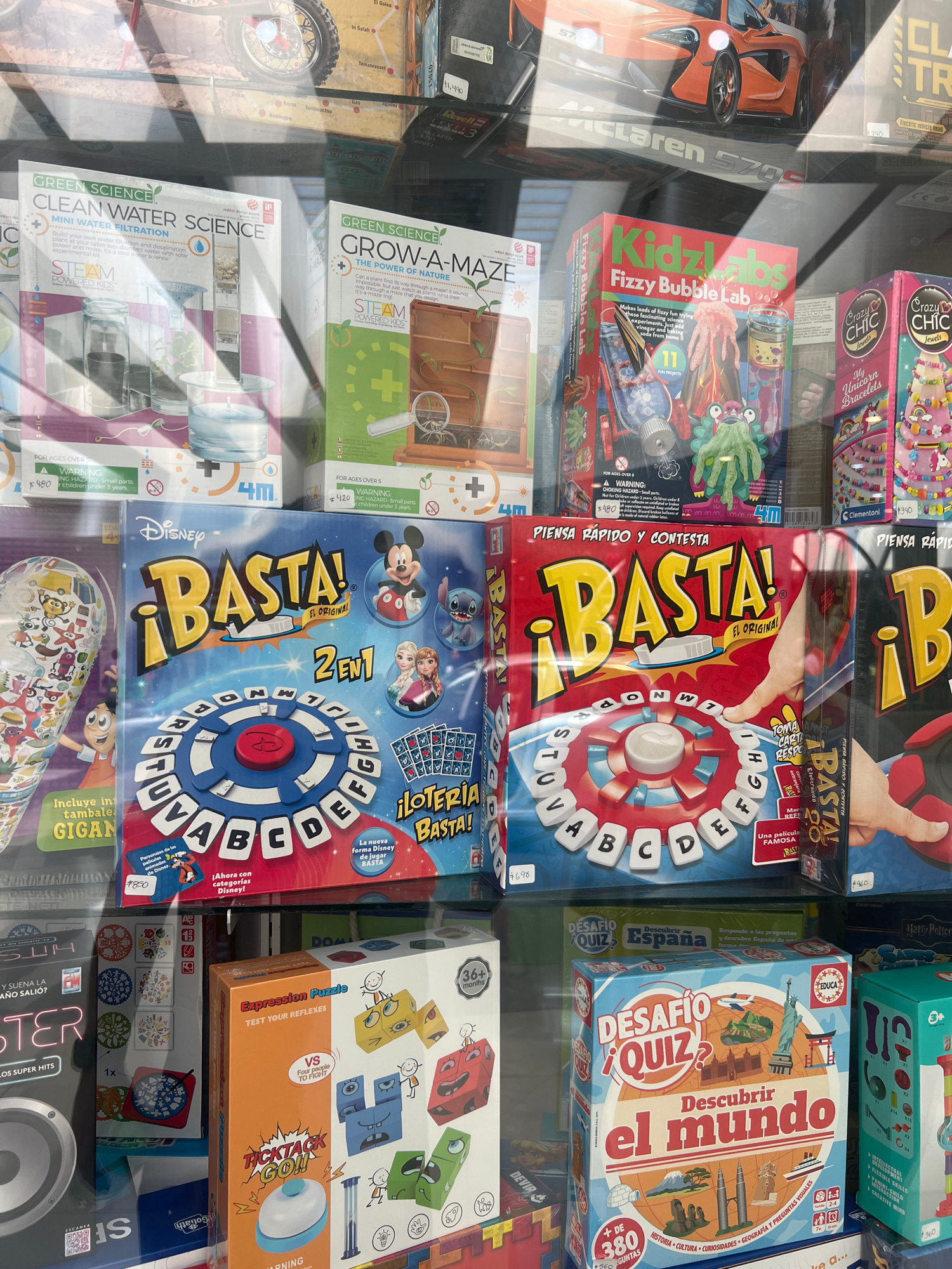 The image shows a display window of a store selling toys and games in Cholula, Mexico. Featured prominently are board games like "BASTA!" (both the original and a Disney-themed version), a quiz game c…read more