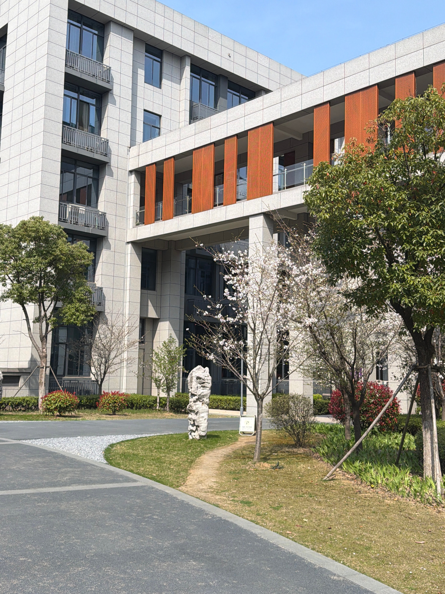 A view of a modern multi-story building with a gray tiled facade and orange accents is partially obscured by trees and greenery. The building's design features angled upper floors and several rows of…read more