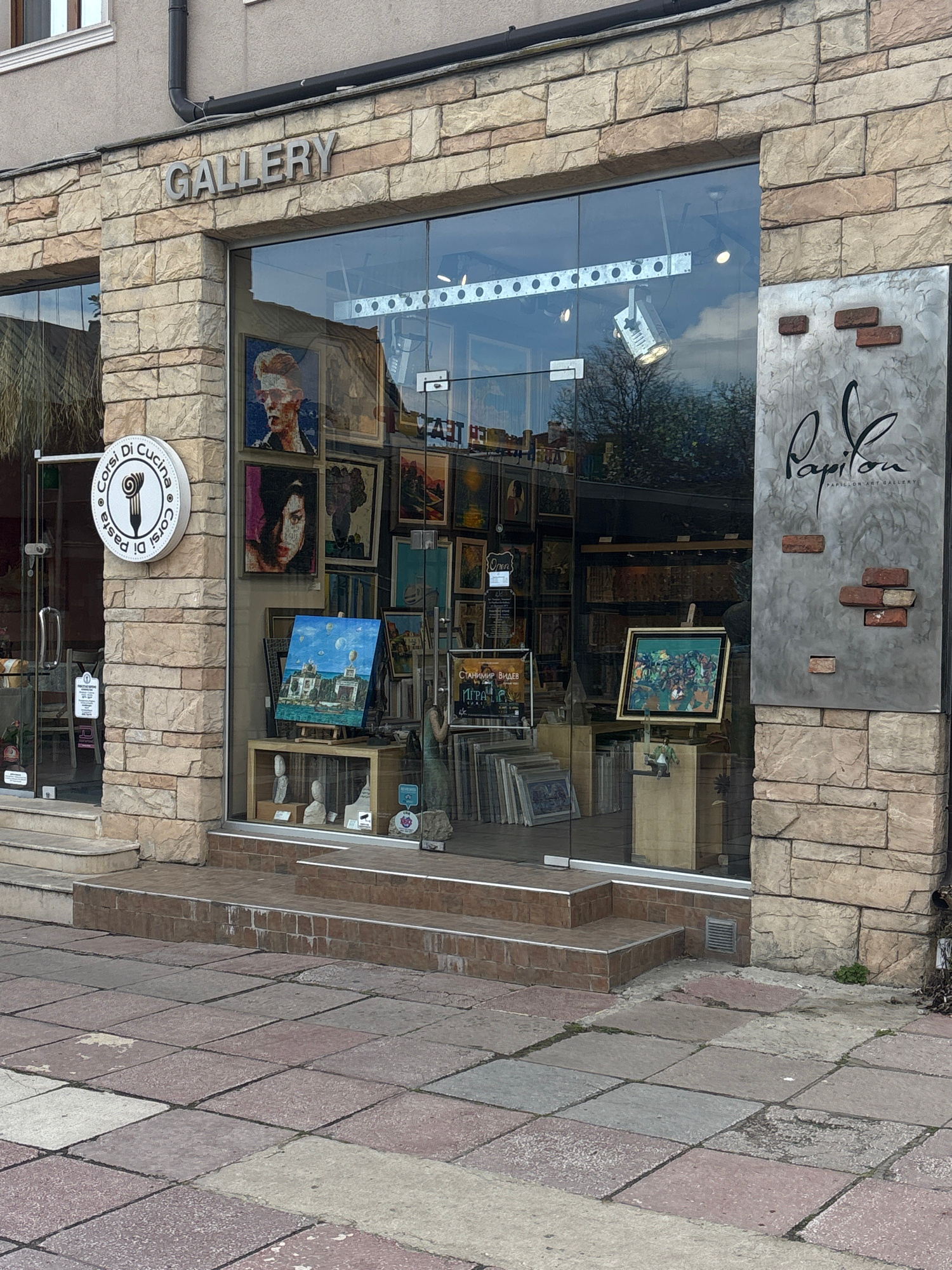 The image shows the exterior of an art gallery and pasta restaurant in Varna, Bulgaria. The gallery, named "Papilon Art Gallery," has a large glass window displaying numerous paintings and artwork. Th…read more