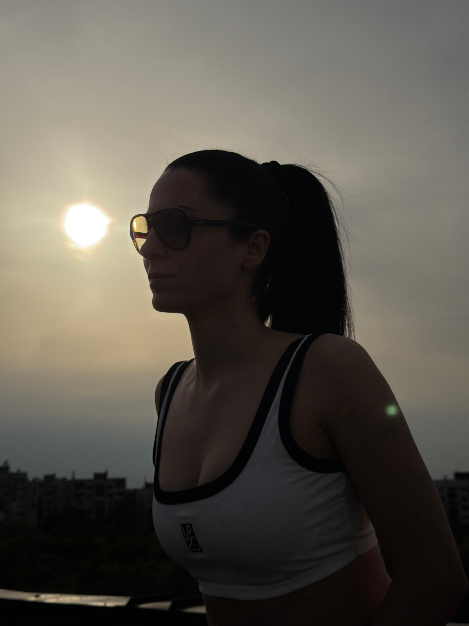 A woman wearing a white sports bra with black trim and sunglasses stands in front of a bright sun, possibly during sunrise or sunset. Her hair is pulled back into a ponytail. In the background, blurre…read more