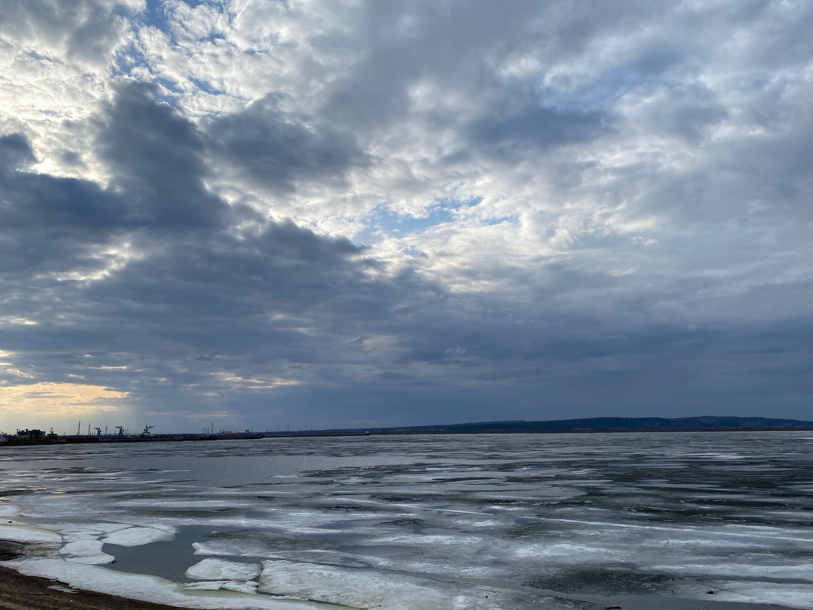 The image displays an expansive landscape featuring a large body of water partially covered by ice under a vast, overcast sky. The sky is filled with dramatic, dark grey clouds, punctuated by patches…read more