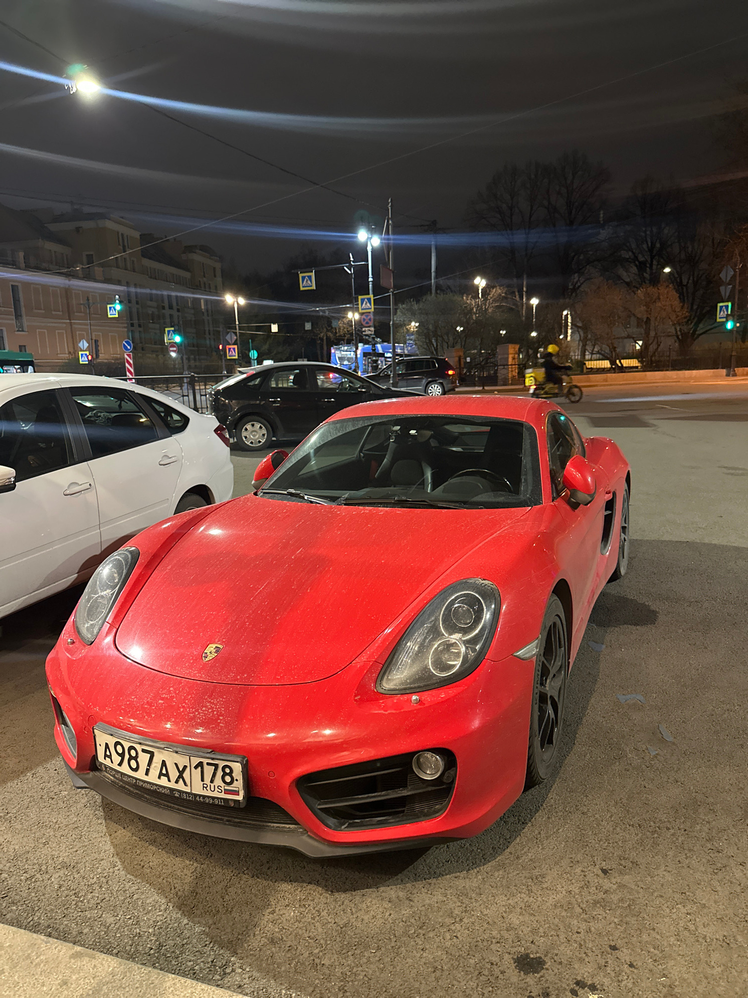 The image captures a street scene at night in Saint Petersburg, Russia. Dominating the foreground is a red Porsche Cayman, parked at an angle on a paved surface. The car's license plate, which is part…read more