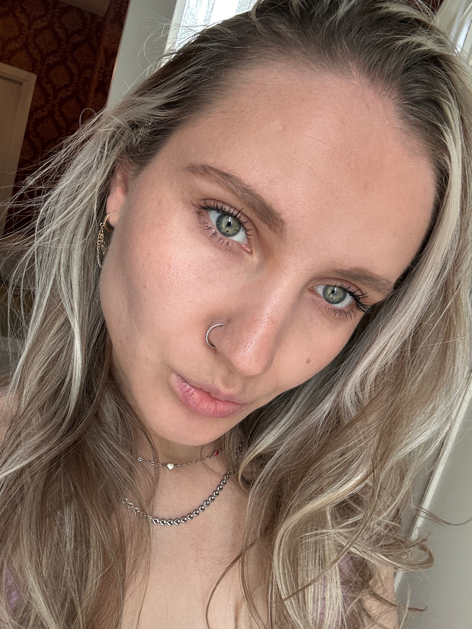 A close-up, angled shot of a woman's face, showing blonde hair with highlights. She has fair skin, green eyes with visible eyelashes, and a nose ring. The background is partially visible with some walβ¦read more