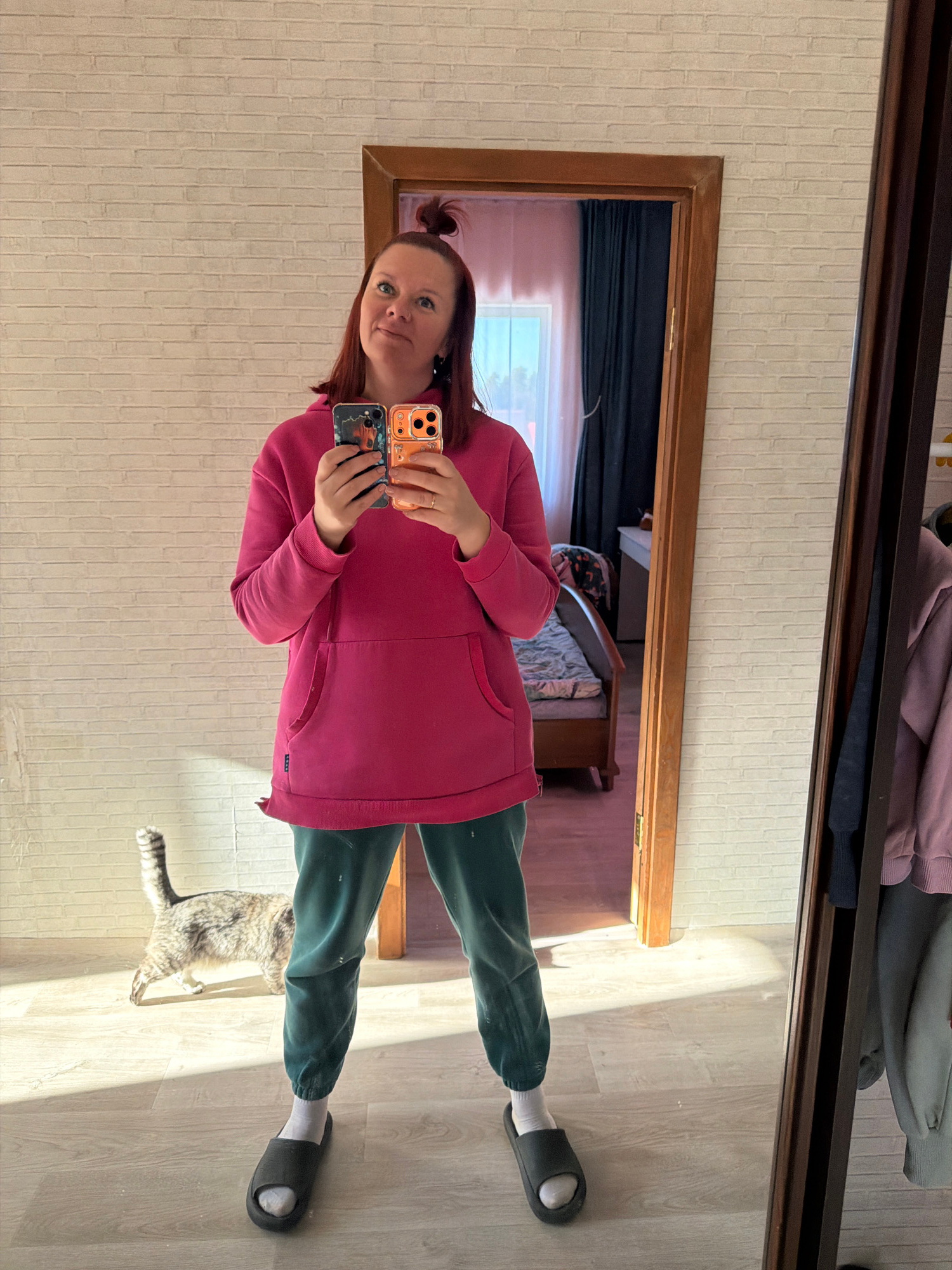 A woman is taking a selfie in a mirror. The mirror is attached to a closet door. The woman is wearing a pink hoodie and green sweatpants, along with black slides. She is holding two cellphones. In the…read more