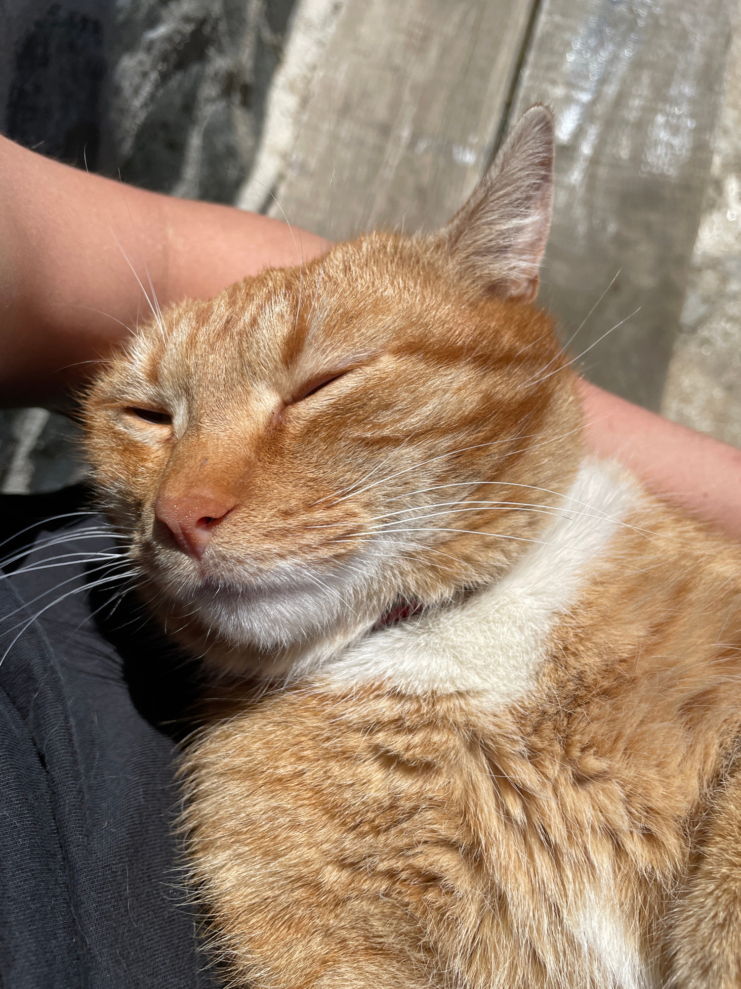 An orange tabby cat with white markings on its chest rests on a person's arm. The cat has its eyes closed and appears to be asleep. The person is wearing a black shirt. The background is partially vis…read more