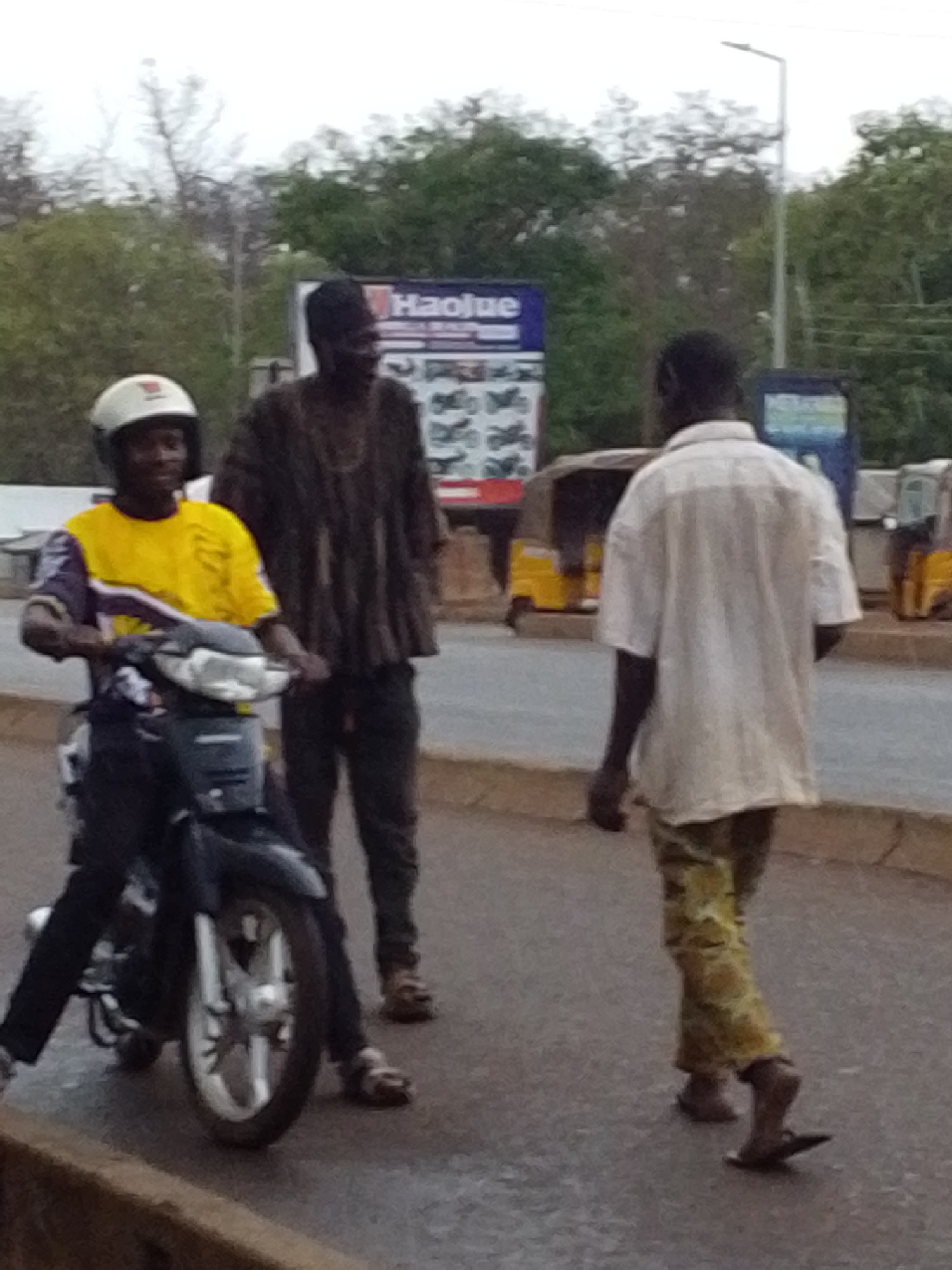 The image shows three men on a road in Tamale, Ghana. A man on the left is wearing a yellow shirt with purple sleeves, black pants, a white helmet, and is sitting on a motorcycle. In the center, a manβ¦read more
