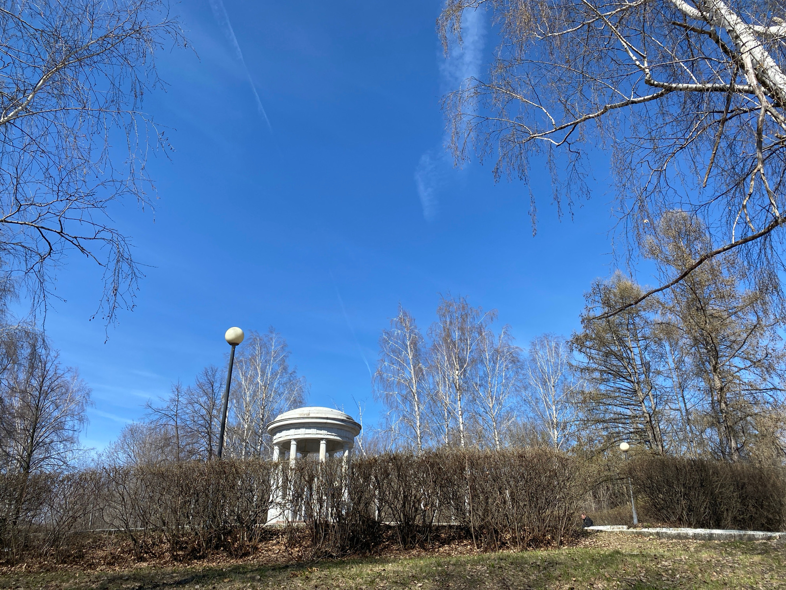 This image depicts an outdoor park scene in Ulyanovsk, Russia, likely captured during late winter or early spring. The dominant feature of the sky is a vibrant, clear blue, with a faint airplane contr…read more