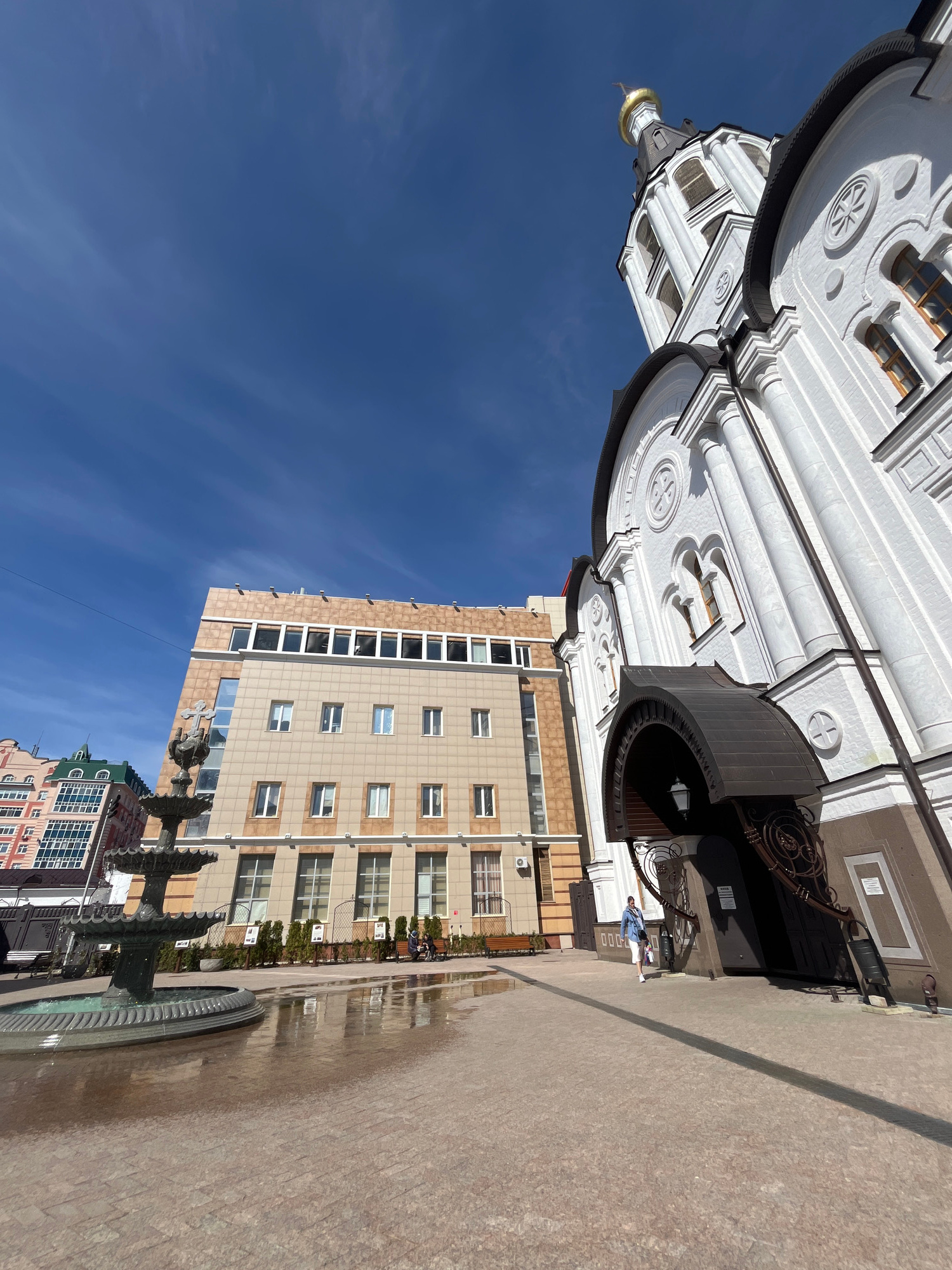 This image captures an outdoor urban scene in Ulyanovsk, Russia, under a bright, clear blue sky with a few wispy clouds. The setting appears to be a city square or pedestrian area, characterized by a…read more