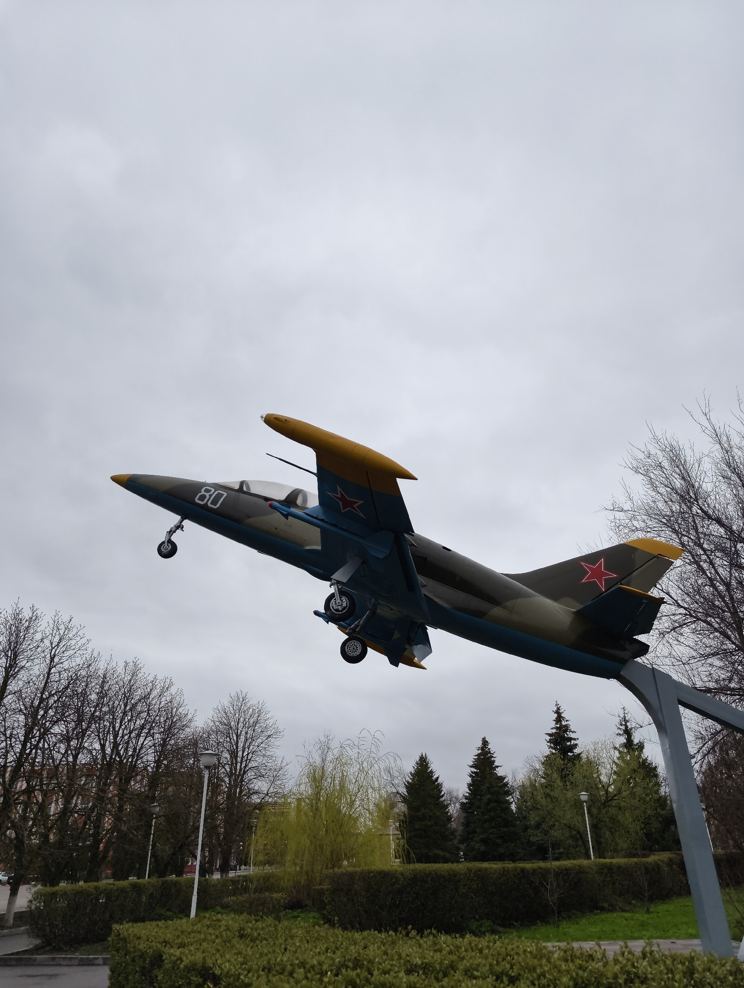 This media file displays a jet aircraft, likely a trainer or light attack model, mounted on a grey metal stand in a public park in Balashov, Russia. The aircraft is angled upwards, as if in flight, an…read more