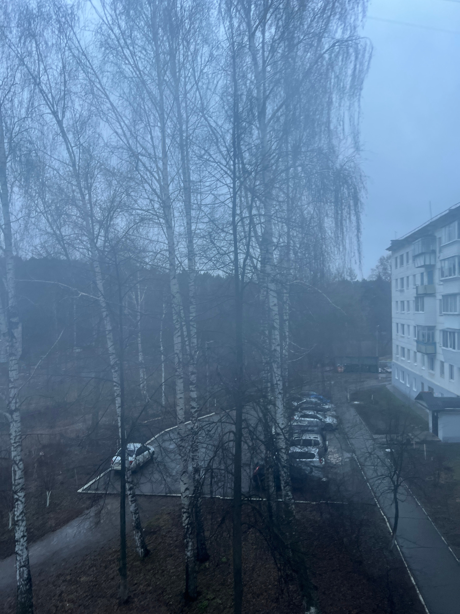 The image, likely taken from an elevated position, overlooks a street in Chaikovsky, Russia. It is a foggy day, with bare trees in the foreground. A multi-story building is visible in the background.…read more