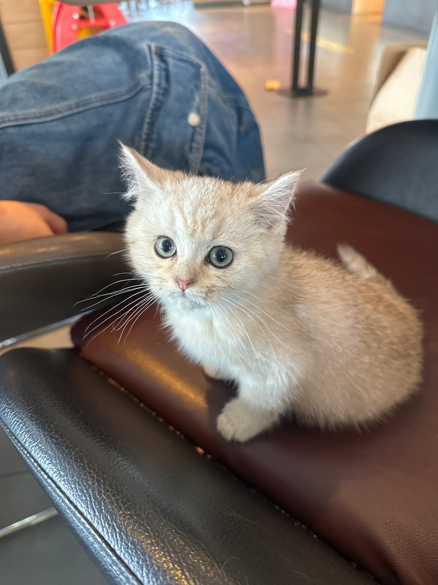 The image displays a close-up, high-angle perspective of a small, fluffy kitten with light cream and white fur. The kitten is the primary subject, looking directly at the viewer with wide, curious blu…read more