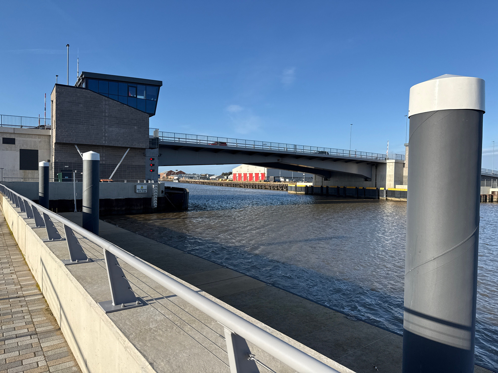 The image shows a bridge over a waterway in Gorleston-on-Sea, United Kingdom. The bridge is a drawbridge, with a control tower visible on the left bank. The waterway is choppy, reflecting the daylight…read more