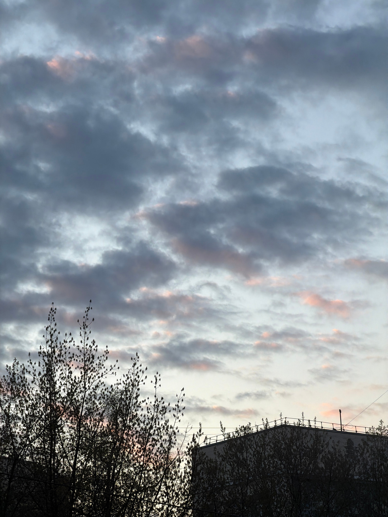 The image depicts a sky with gray and white clouds, some tinged with pink, likely at sunset. Silhouetted in the foreground are tree branches and part of a building's edge. The location may be Moscow,…read more