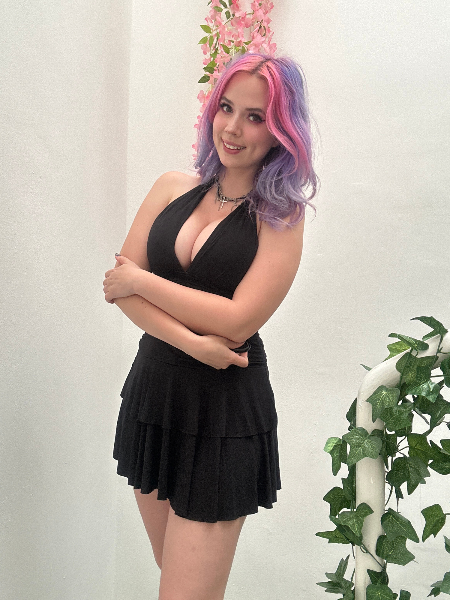 A young woman with long, wavy hair, dyed in vibrant shades of pink and purple, is the central subject of this brightly lit, indoor portrait. She appears to be in her late teens or early twenties, with…read more