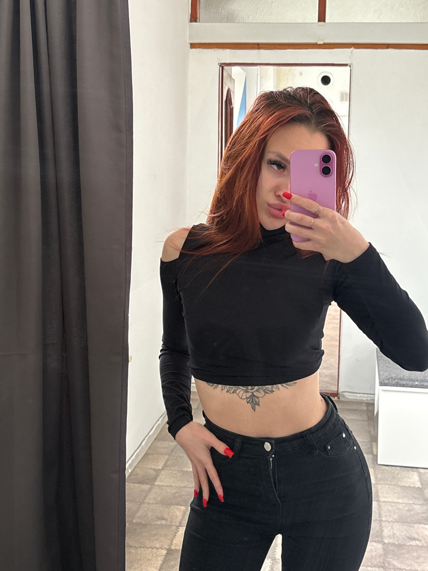 The image displays a mirror selfie of a female individual indoors, identified as being in Simferopol, Ukraine. The subject, a young adult female with long, reddish-brown hair, is captured from mid-thiβ¦read more