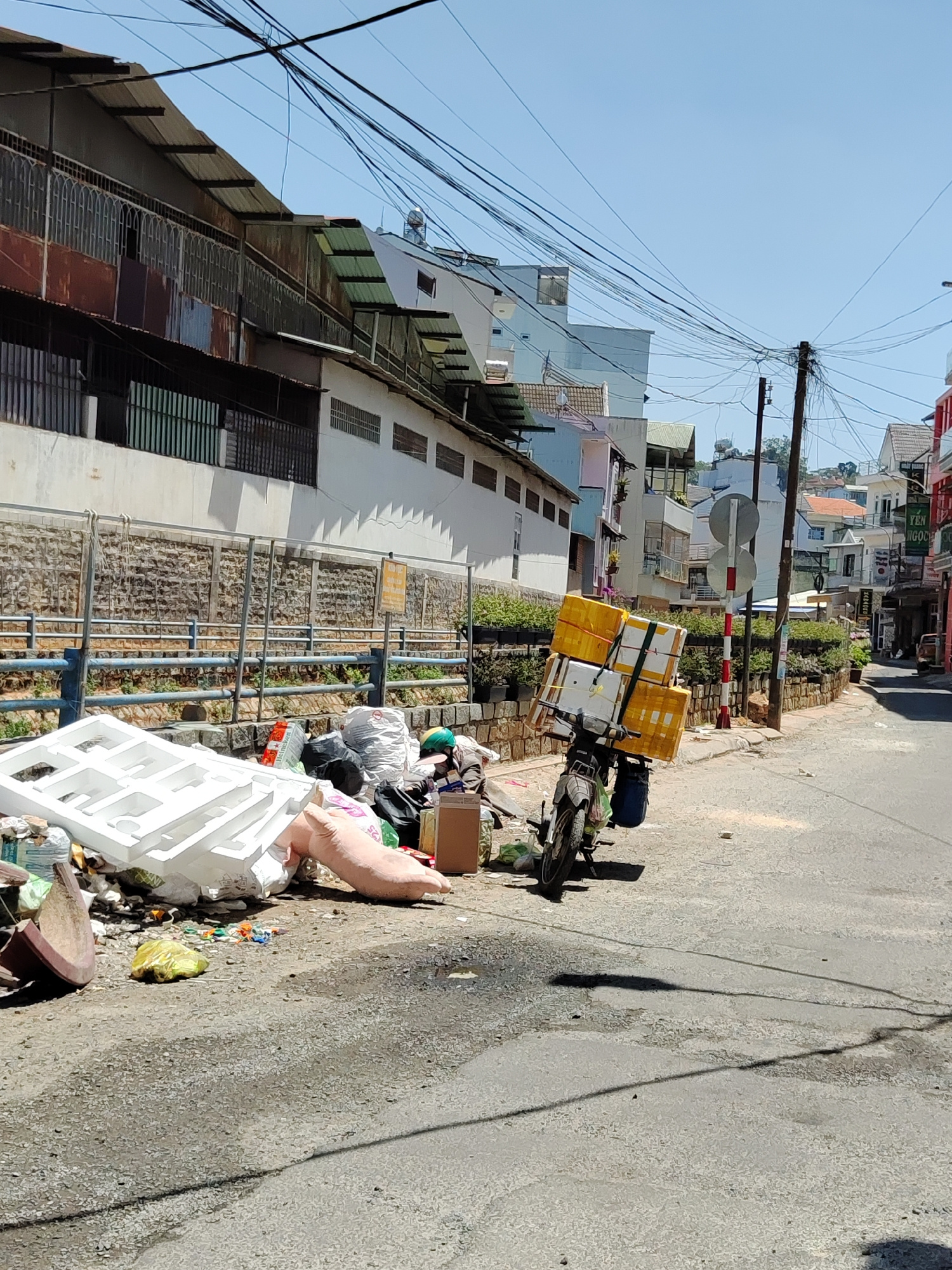The image depicts a street scene in Da Lat, Vietnam. A pile of garbage is on the side of the street, including styrofoam, plastic bags, and other discarded items. A motorcycle laden with several yello…read more