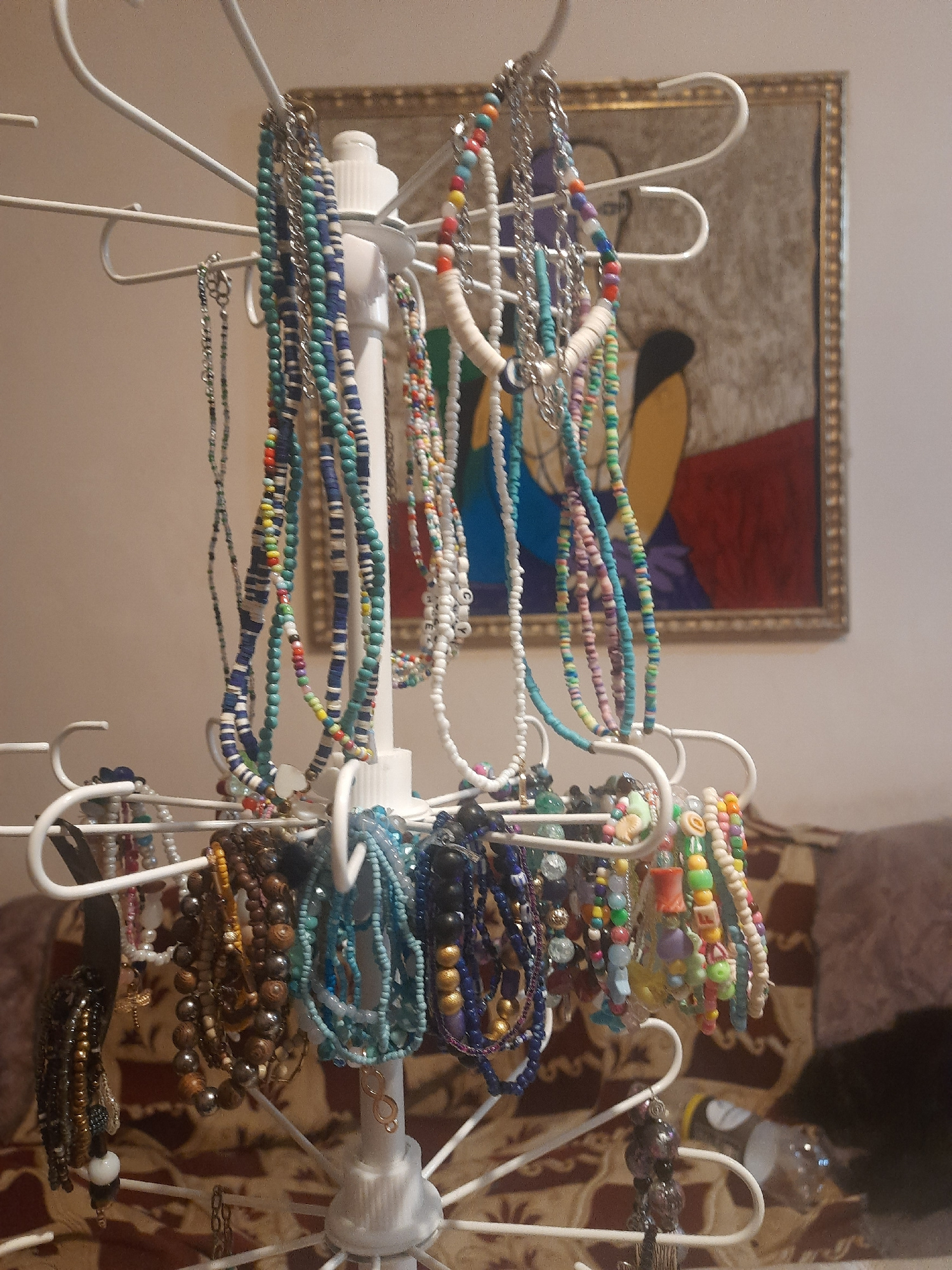 A rack of beaded necklaces of various colors, textures, and sizes sits indoors in Al Hadaba, Egypt. Behind the rack is a framed abstract painting and a patterned fabric.