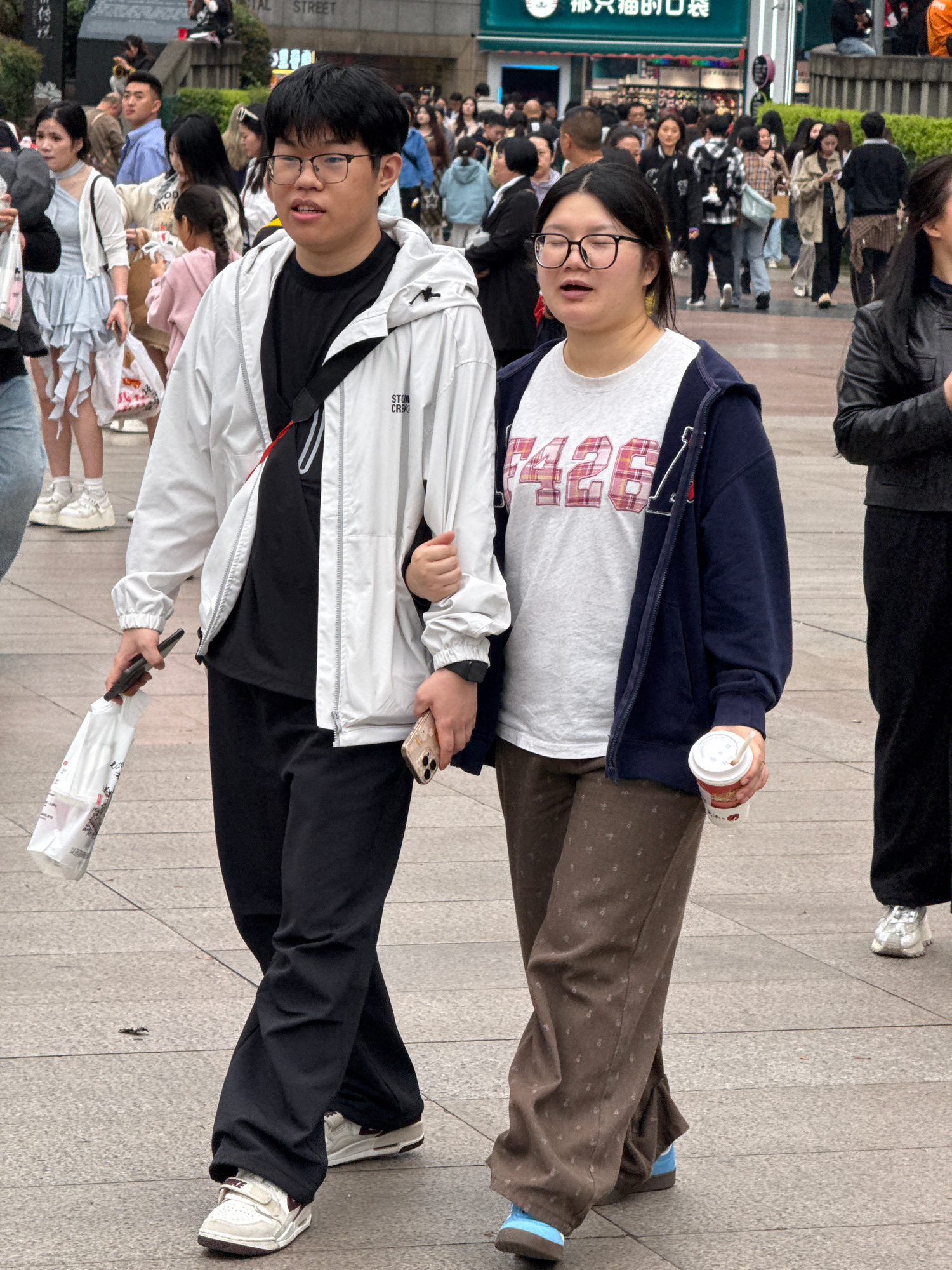 Two people stand in the foreground on a gray paved surface. The person on the left wears glasses, a black t-shirt, a white jacket, and black pants, holding a phone and a white bag. The person on the r…read more
