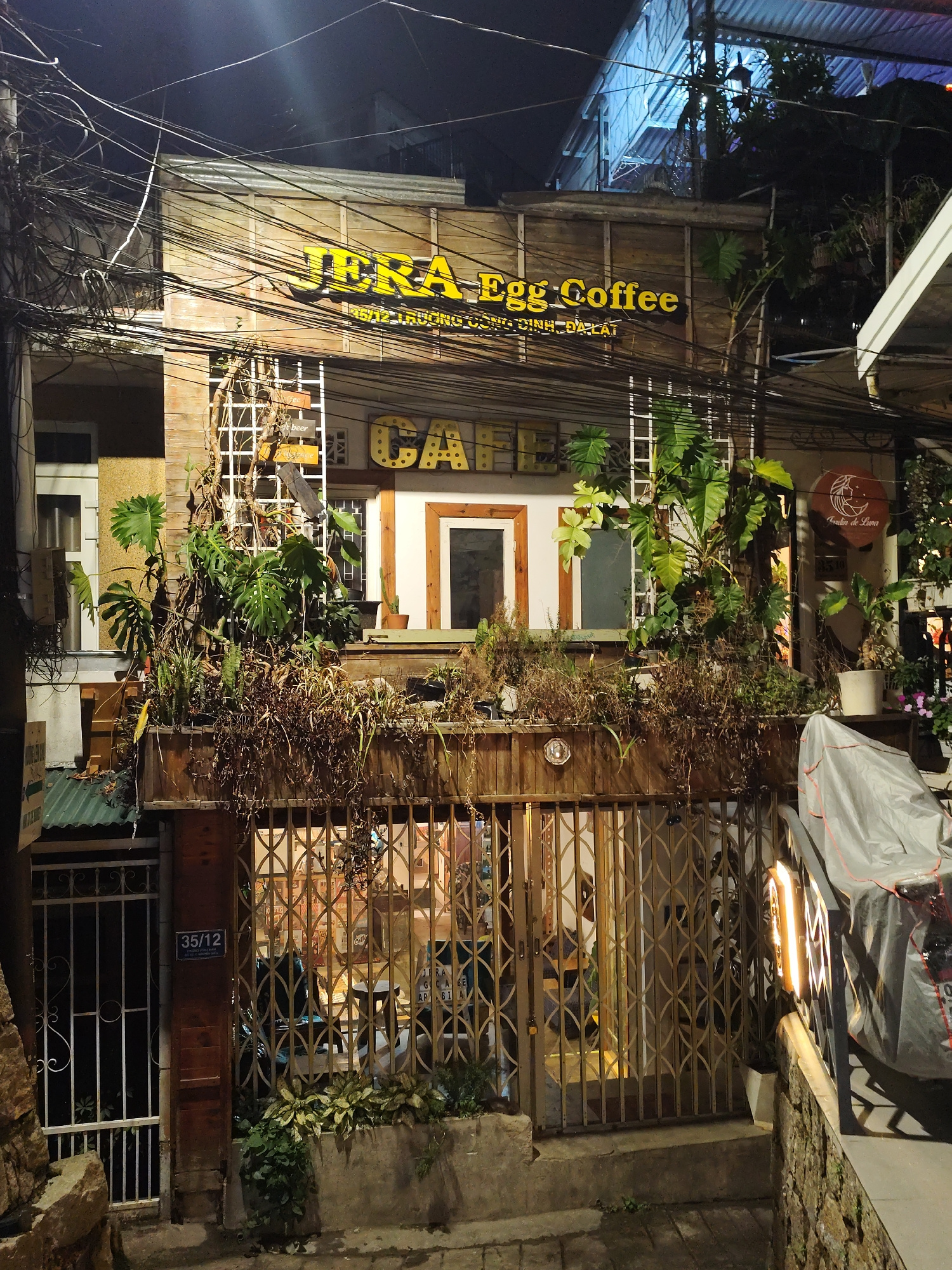 The image displays the illuminated facade of a multi-story building at night, identified as "JERA Egg Coffee" in Da Lat, Vietnam. The building features a rustic design with wooden paneling on its uppe…read more