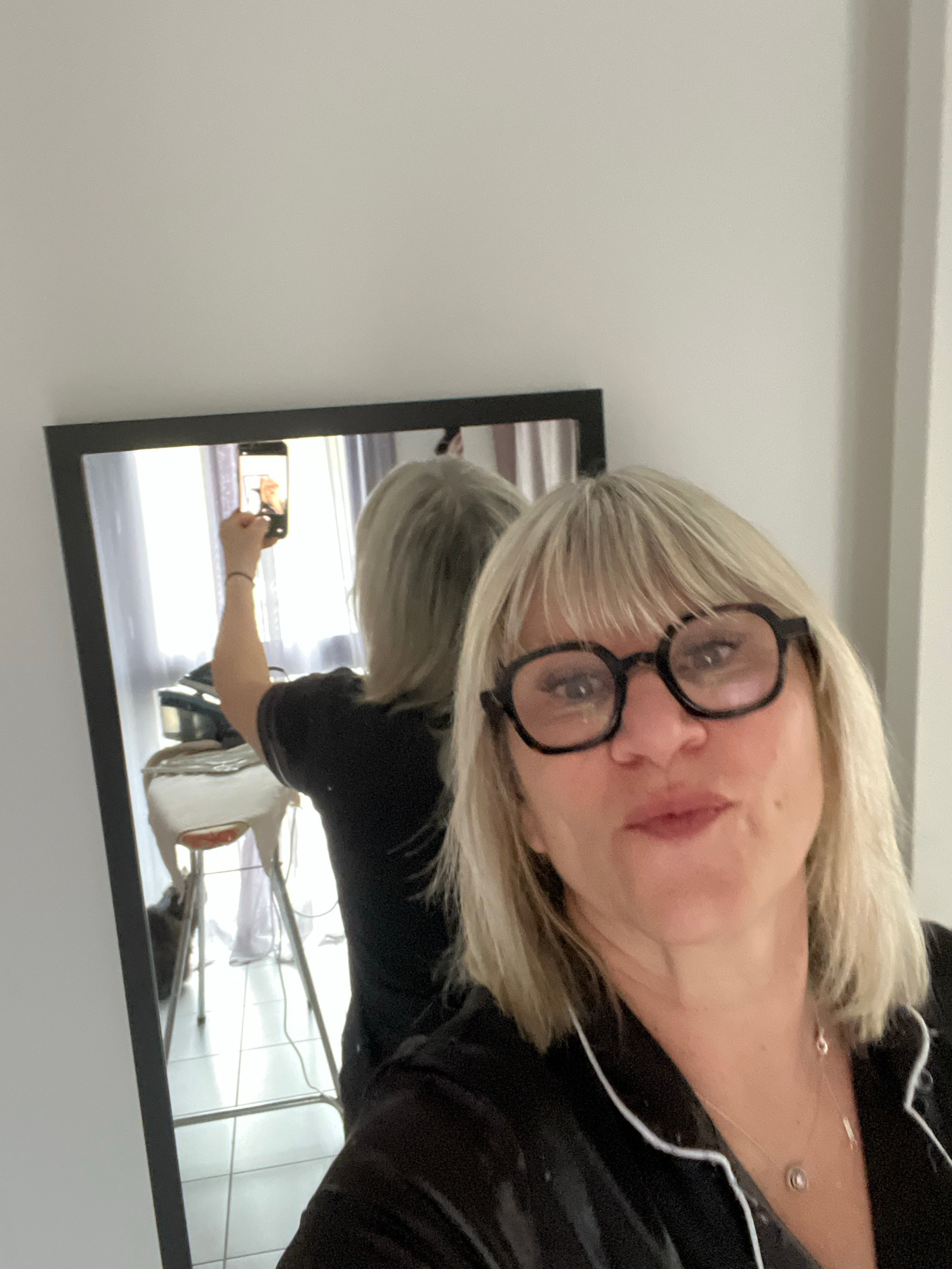 A person with blond hair and black-rimmed glasses, wearing a black top with white piping, is taking a selfie in a mirror. The reflection in the mirror shows the person holding a smartphone, presumably…read more