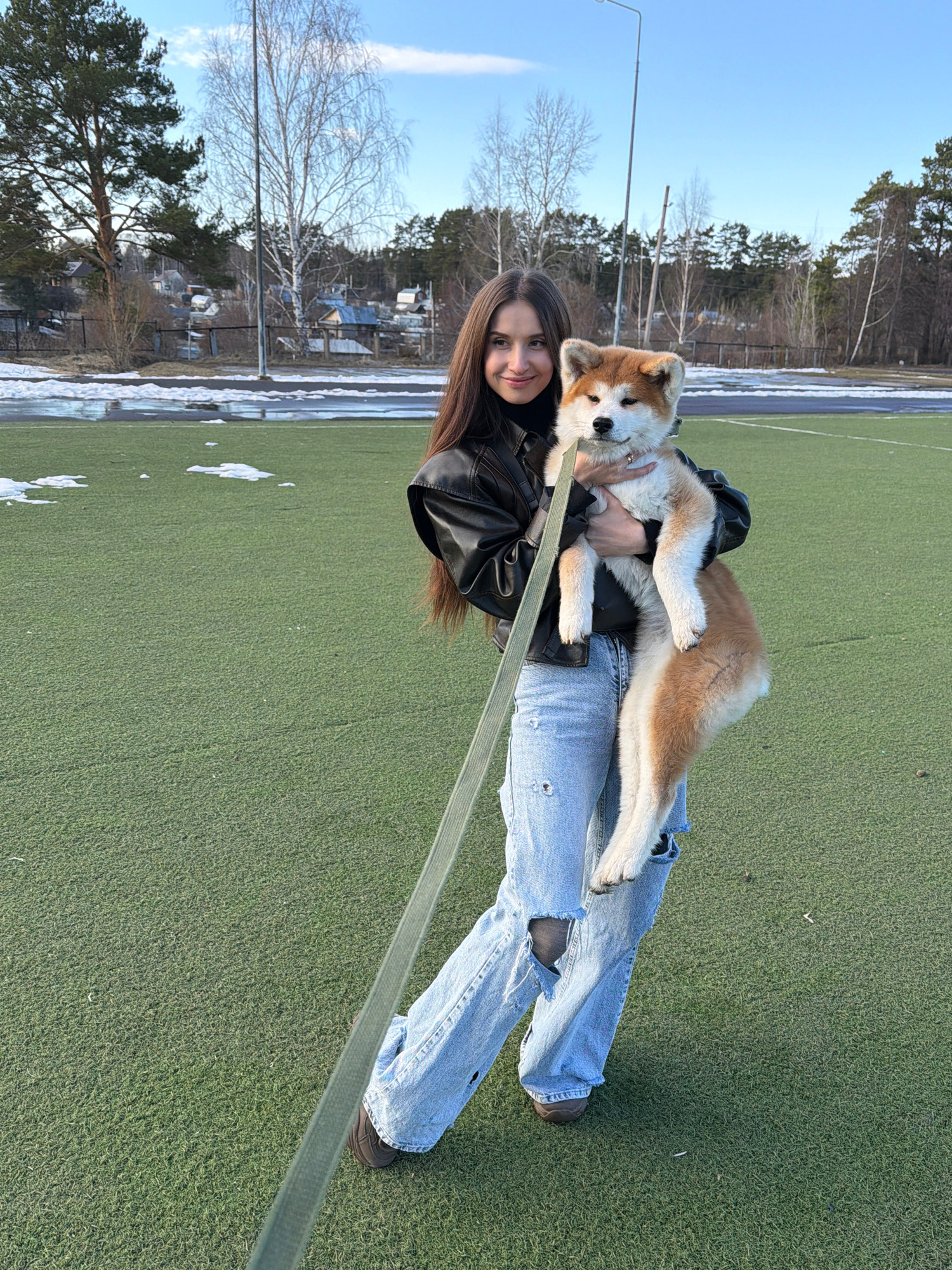 A young woman stands on a green field near Chaikovsky, Russia, cradling a tan and white Akita puppy in her arms. She wears a black leather jacket and ripped blue jeans. The puppy lies across her torso…read more