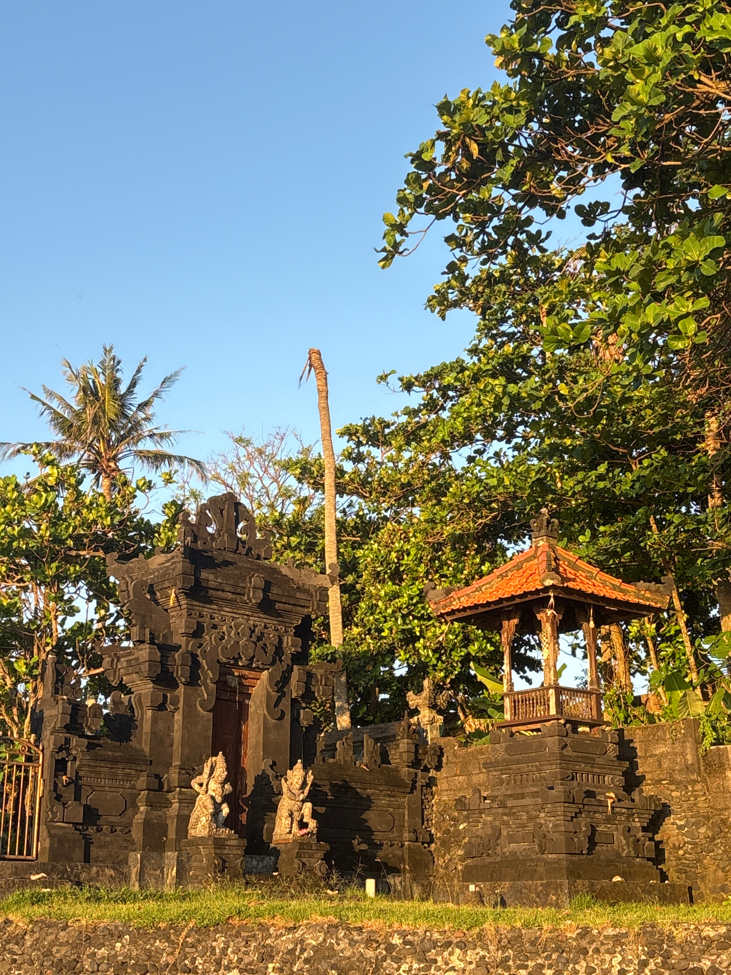 This image captures a tranquil outdoor scene showcasing traditional Balinese architecture and lush tropical nature. In the foreground, a dark, intricately carved stone temple structure stands prominen…read more