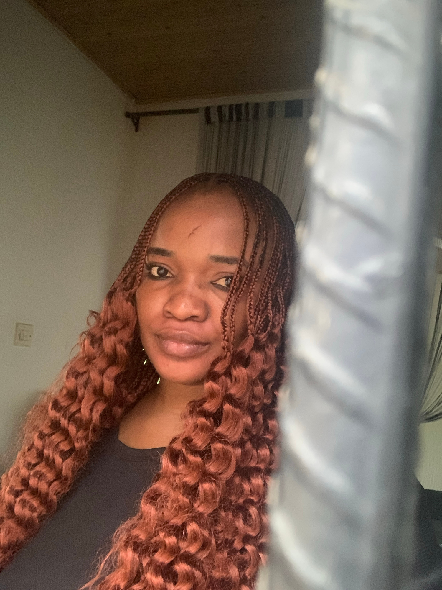 The image is a selfie taken from a low angle of a Black woman. She has brown braided hair with curly ends. She is wearing a dark-colored shirt. The background includes a wall, a door frame, and what a…read more