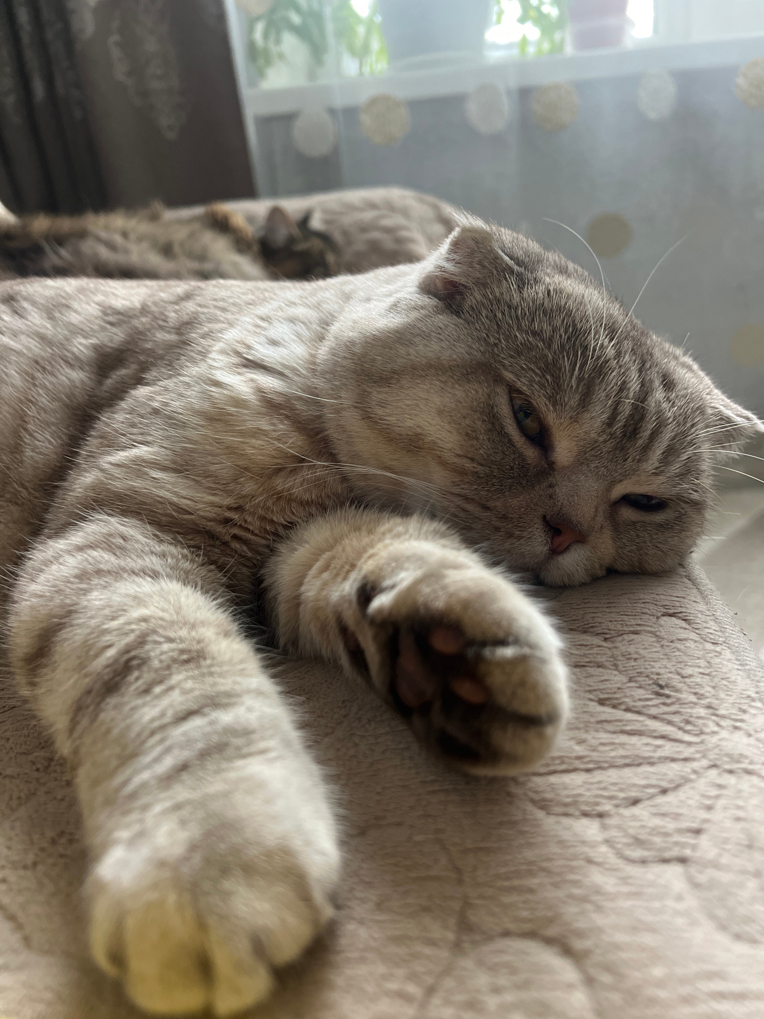 An adorable tabby cat, possibly a Scottish Fold or British Shorthair due to its small, folded ears and plush fur, is captured in a close-up shot. The cat, displaying shades of gray and silver with dar…read more