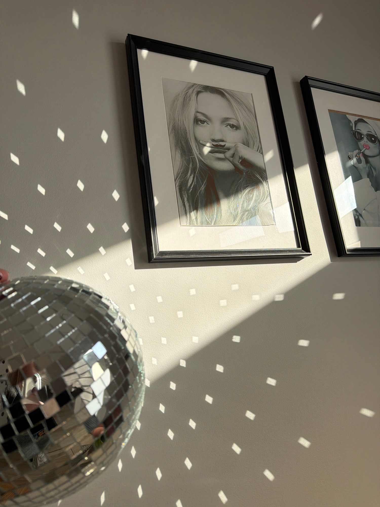 An indoor scene, situated in Riga, Latvia, features a light-colored wall partially illuminated by direct sunlight. In the lower-left foreground, a chrome disco ball, composed of numerous square mirrorβ¦read more