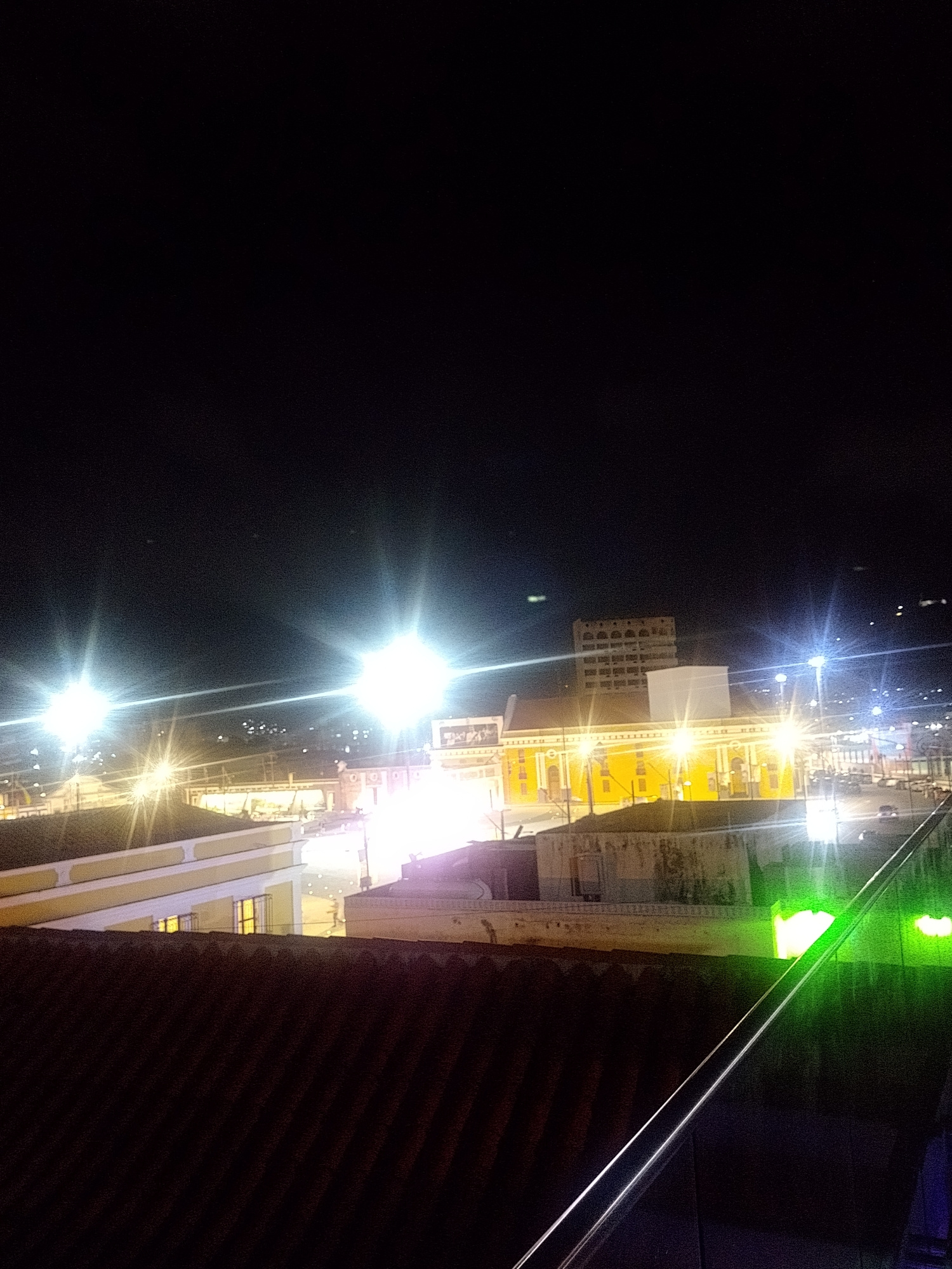 The image shows a nighttime view of Puerto Cabello, Venezuela. A large, brightly lit yellow building with white trim dominates the middle ground, with a tall white structure behind it, and a multisto…read more