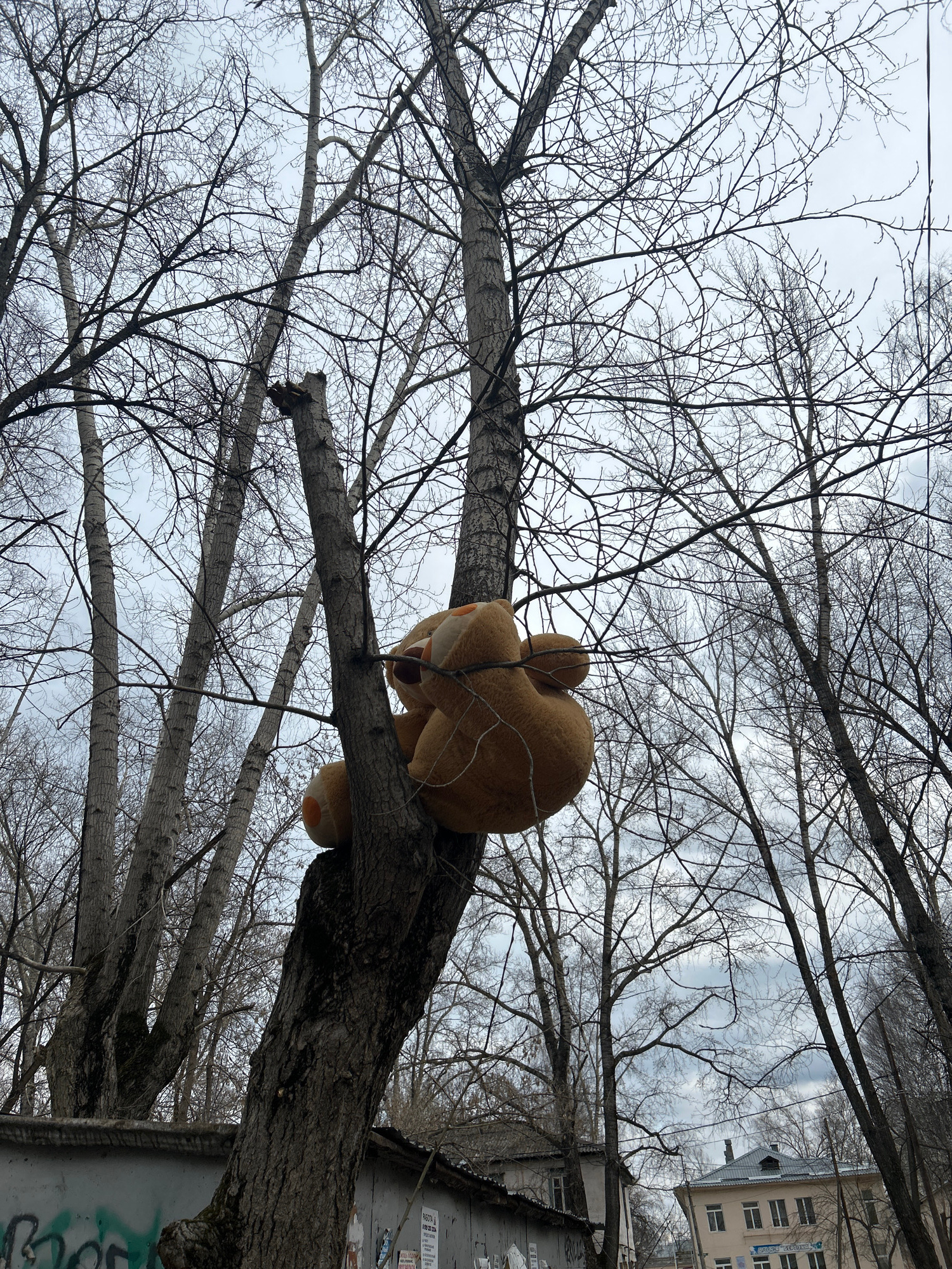 The image, captured in Chaikovsky, Russia, presents a large, light brown plush toy nestled high within the bare branches of a deciduous tree. The toy, resembling a bear or similar animal, is viewed fr…read more