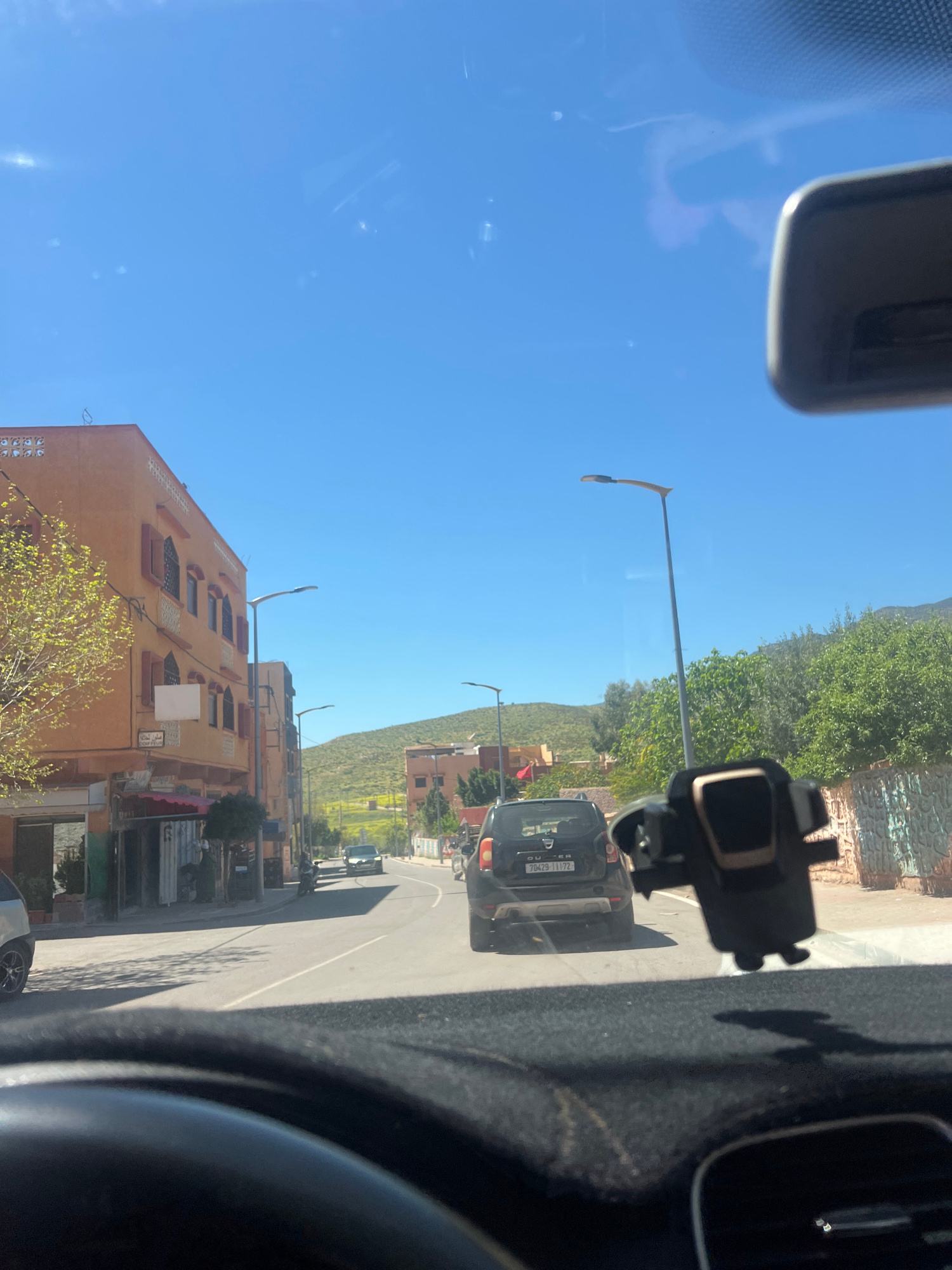 View from inside a vehicle traveling on a street in Ouaouizert, Morocco. The sky is bright blue. Buildings line the street, which curves slightly. The terrain rises in the background. A dark-colored S…read more