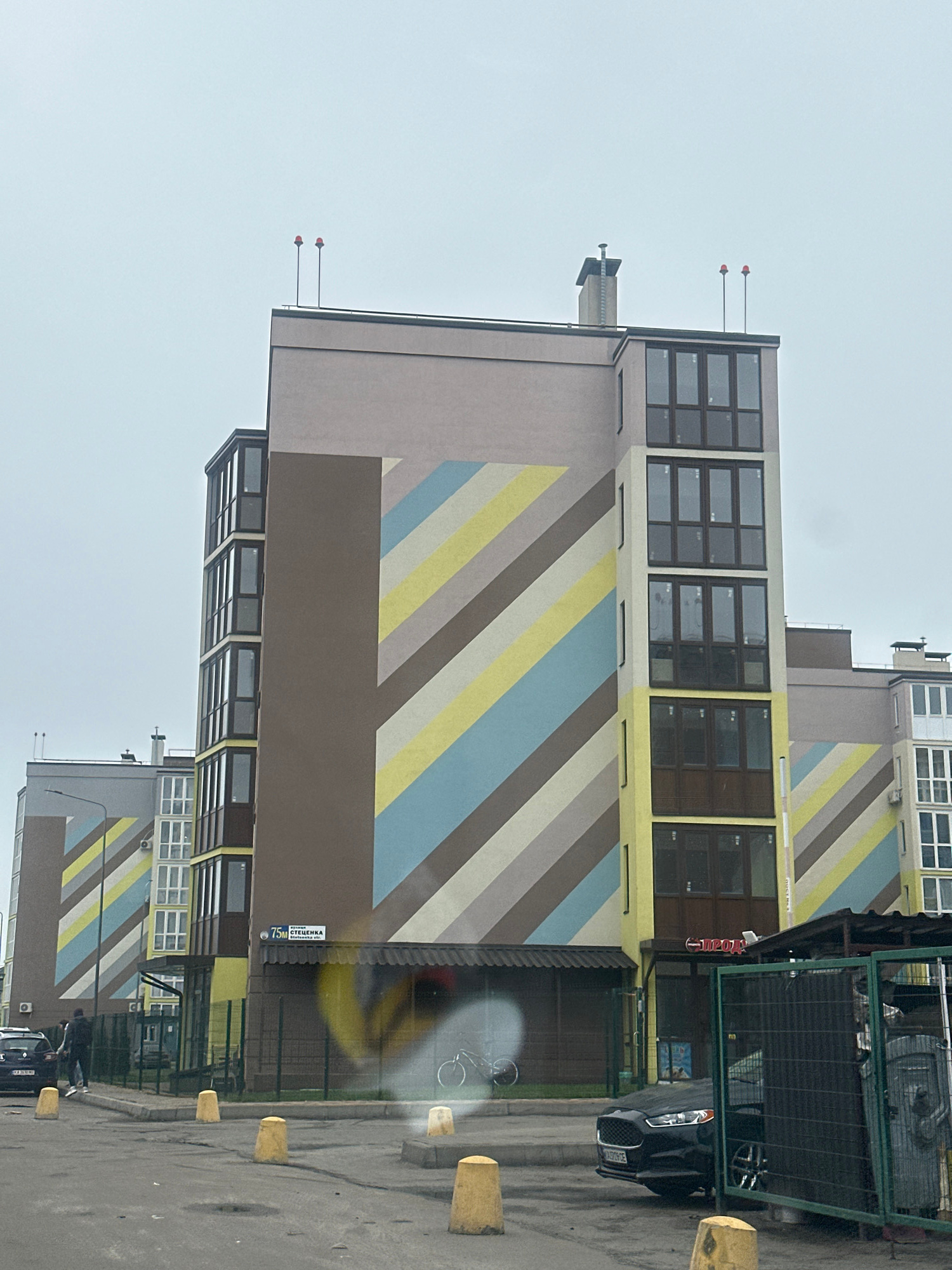 A building is seen in the city of Kyiv, Ukraine. The building has a distinctive stripe pattern. The street sign "75 Стеценка" is visible, indicating the building's location on Стеценка street. The sur…read more
