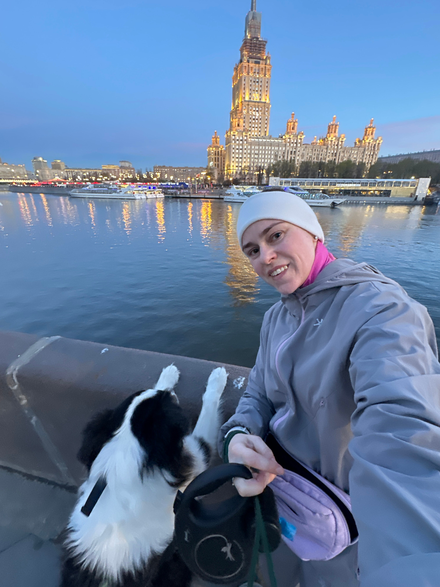 The image captures a woman and her dog outdoors during dusk or early evening, positioned along a river in Moscow, Russia. The photograph appears to be a selfie taken by the woman. In the foreground,…read more