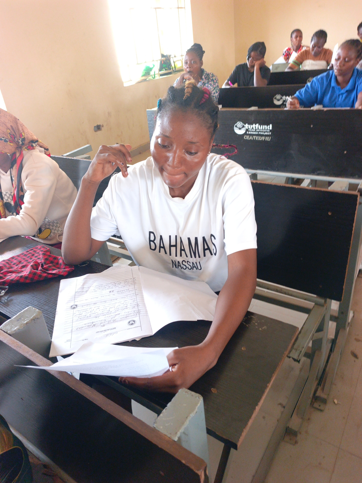 The image depicts a classroom setting, possibly in Akwanga, Nigeria, based on the student population and the presence of "totfund" branded desks, a developmental project. The foreground shows a woman…read more