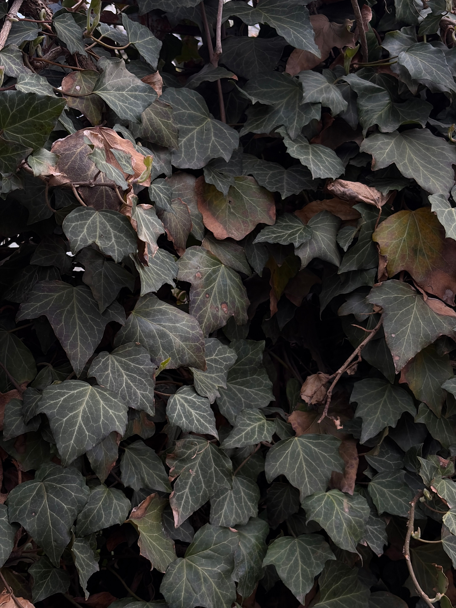 The image shows a dense patch of ivy with dark green and brownish leaves. Some of the leaves are decaying. The lighting is dim, and there are dark shadows within the foliage. There is also some thin,…read more