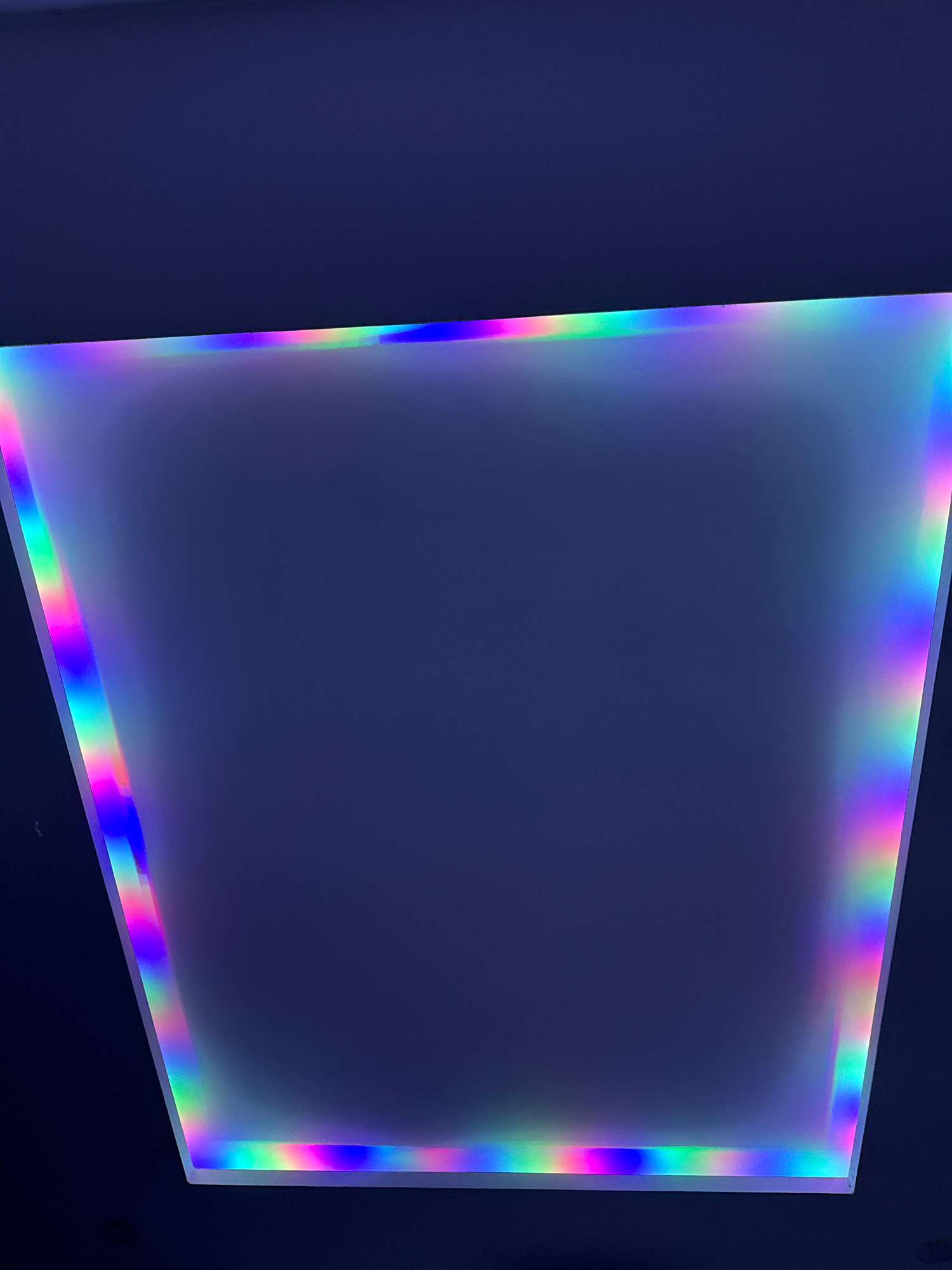 A rectangular light box with a rainbow colored edge is mounted on a dark blue wall. The light box dominates the scene, with its vibrant edge providing a sharp contrast to the somber background. The lo…read more