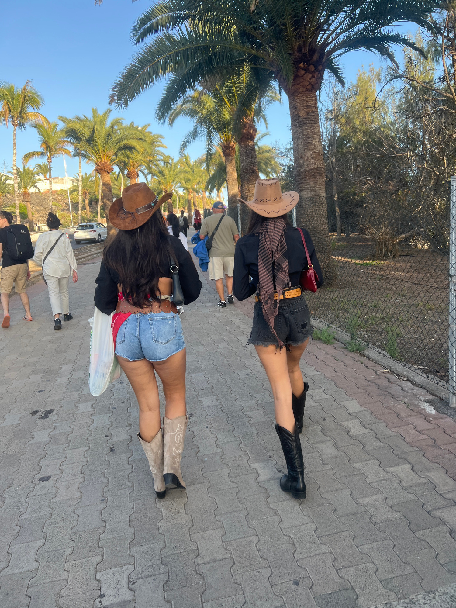 The image captures a street scene in San Bartolomé de Tirajana, Spain. Two women wearing cowboy hats and cowboy boots are walking on a paved sidewalk, surrounded by palm trees and other pedestrians. O…read more
