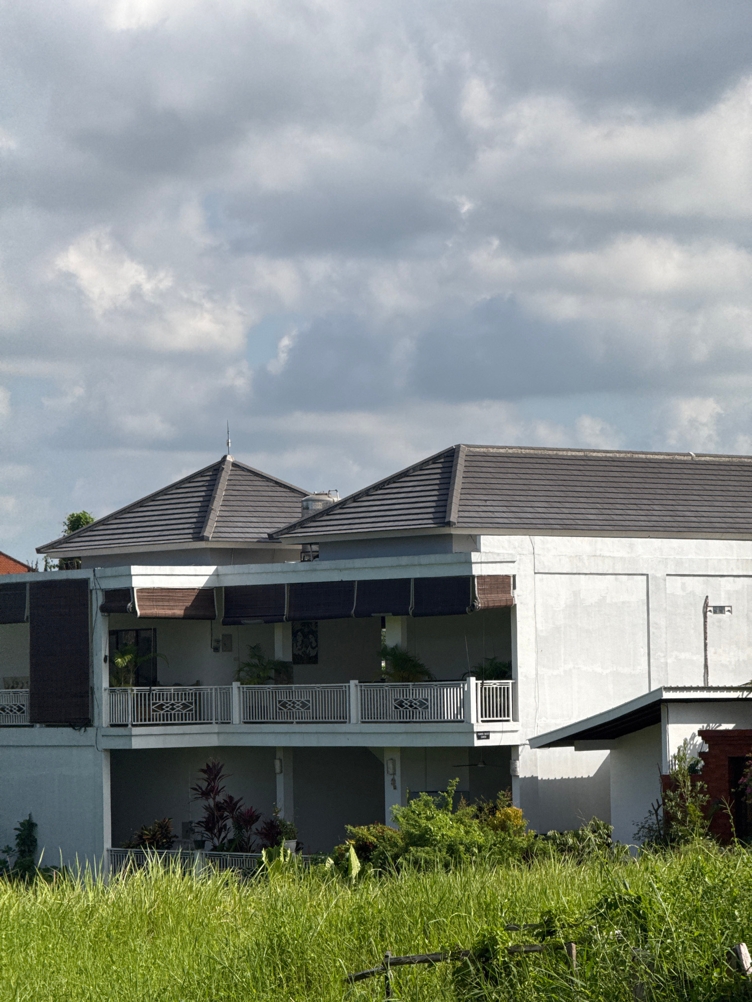 The image presents a view of a building, characterized by a grey tile roof and white exterior walls, under a cloudy sky. The building's design incorporates balconies with white railings. Lush green gr…read more
