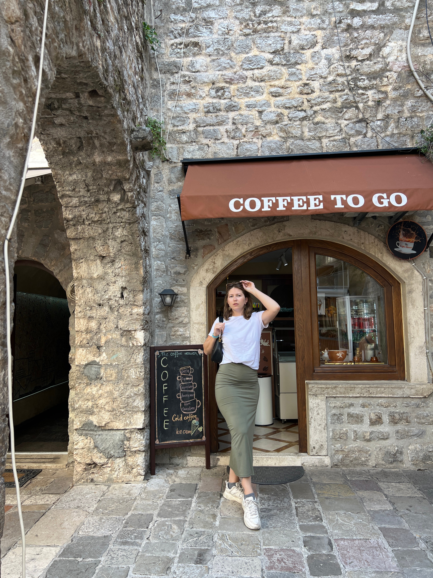 A young woman stands posing in a narrow, historic stone alleyway in Budva, Montenegro, next to the entrance of a "COFFEE TO GO" shop. The scene is bathed in bright daylight, suggesting a clear day. T…read more