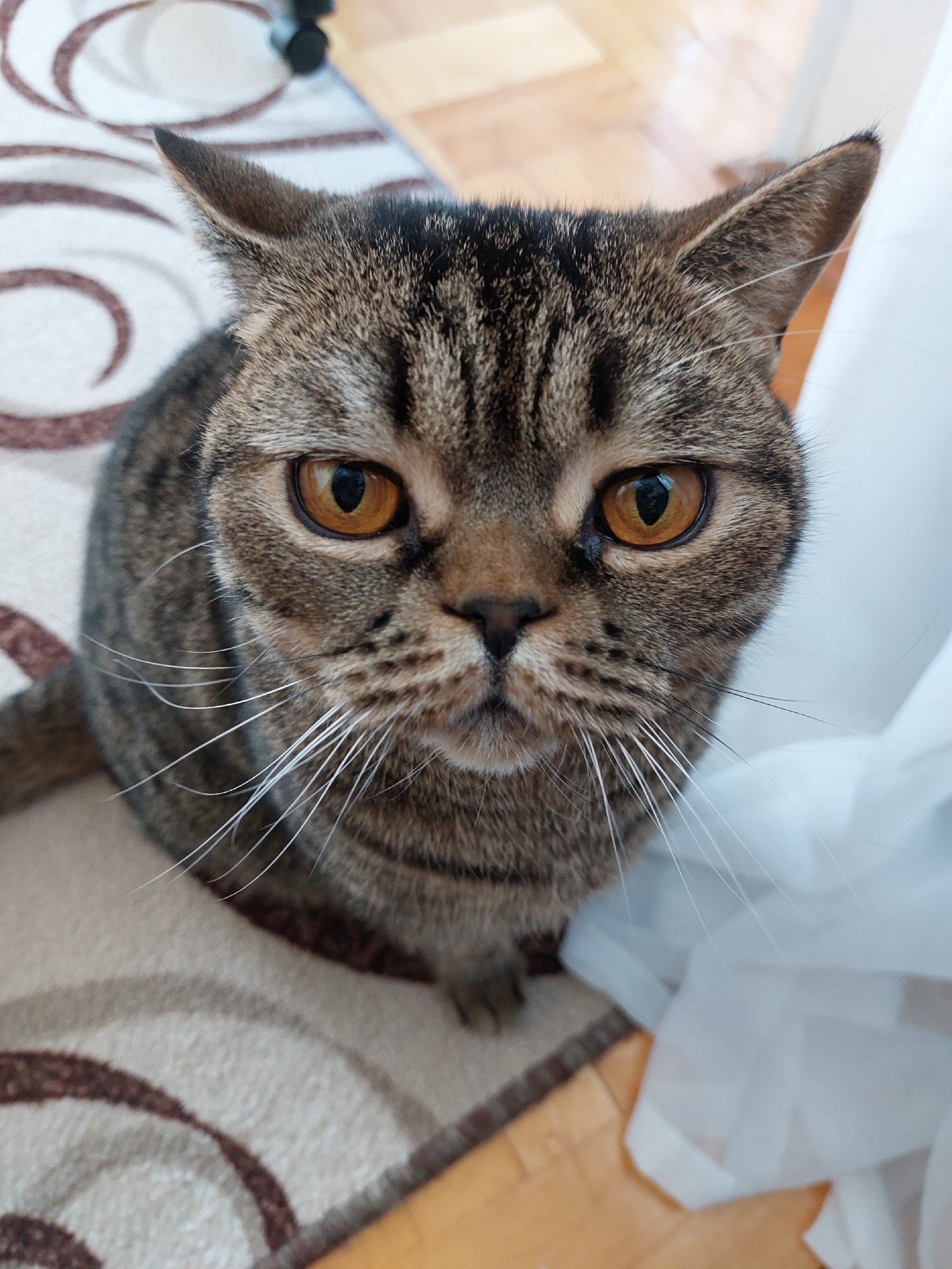 A close-up, high-angle shot features a tabby cat with amber-colored eyes and white whiskers. The cat is positioned on a patterned rug with white and brown circular designs. A wooden floor is visible i…read more