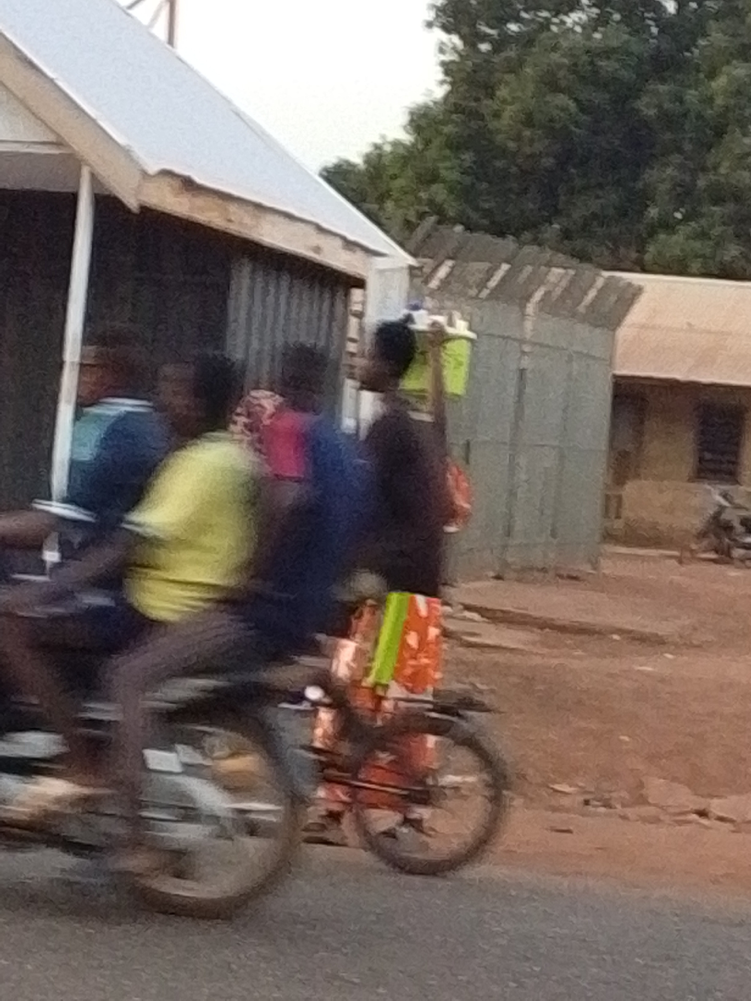 In Tamale, Ghana, a motorcycle carries multiple passengers. One individual balances items on their head while riding the bike. Nearby, buildings and trees make up the environment. The image has motion…read more
