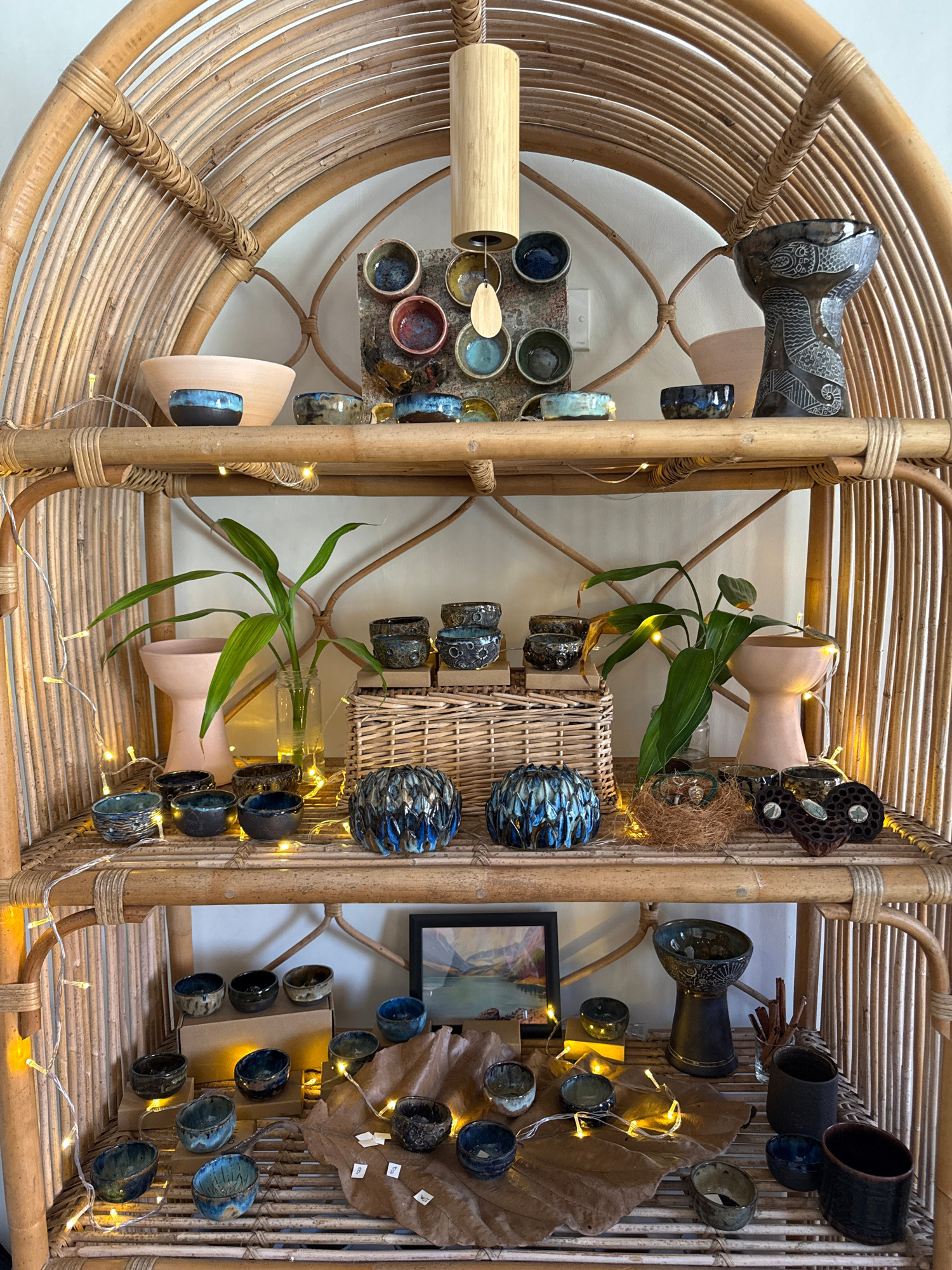 This media file captures a vibrant, vertically oriented display of handcrafted ceramics and natural decor, set within a rustic bamboo structure. The scene is an indoor artisanal display, consistent wi…read more