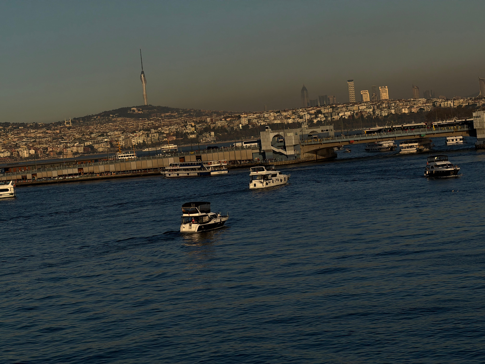 The image shows a body of water with several boats in the foreground. In the background, there is a cityscape with a variety of buildings, including a tall, modern tower on a hill. The city appears de…read more