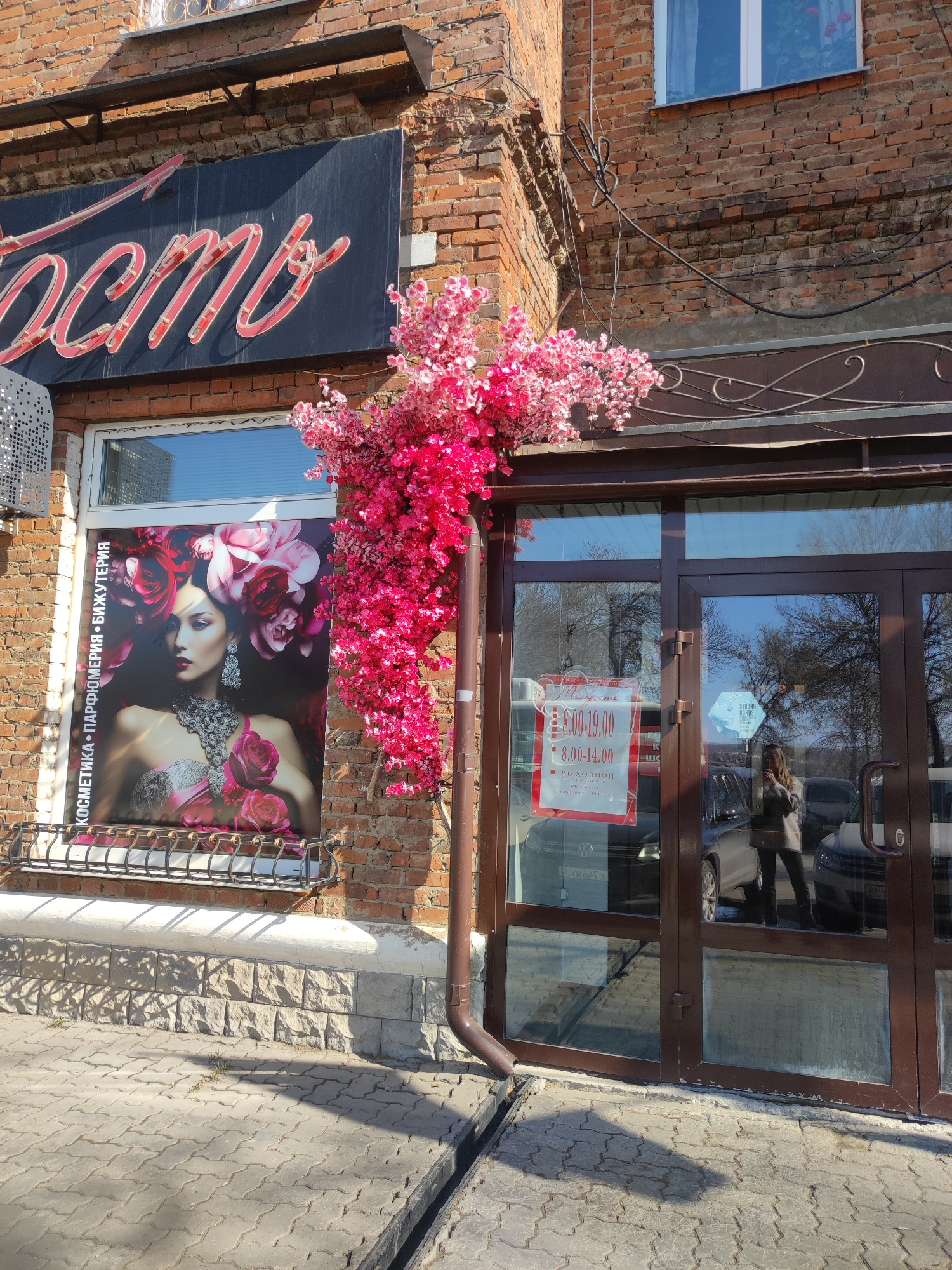 The photograph shows the exterior of a storefront in Votkinsk, Russia. The building is constructed of red brick with a stone base. Above the window, a black sign with script in a reddish-pink color is…read more