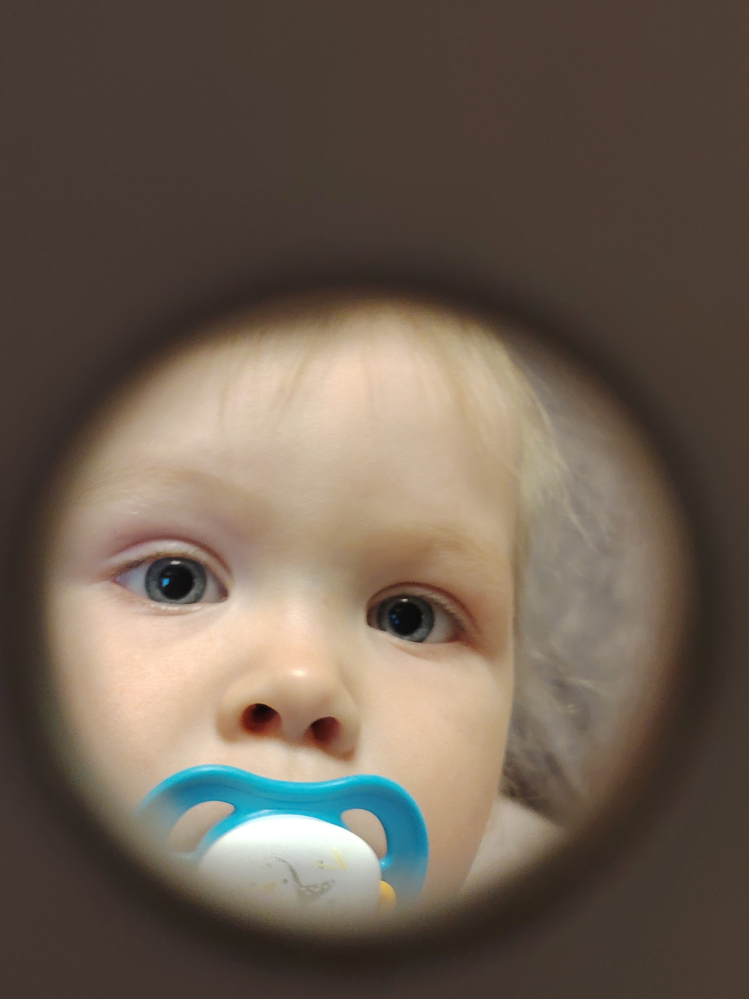 A close-up, eye-level shot shows the face of a young child with light skin, framed by what appears to be a circular hole or opening. The child has fair hair and blue eyes. A blue and white pacifier is…read more